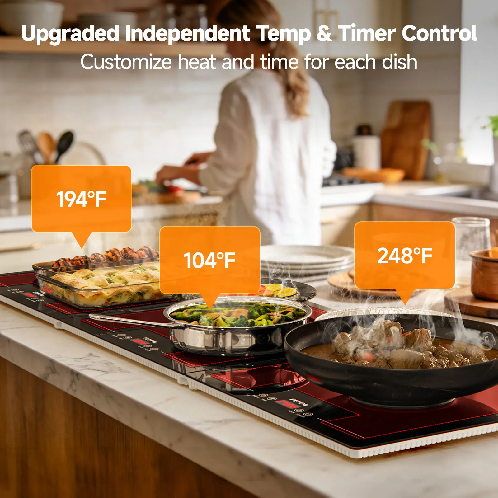 Independent Temp & Timer Control – Precise Heat for Each Dish: This upgraded electric warming tray lets you set temperature and run time independently by panel, so sides can stay gently warm while mains hold hotter at the same time. Choose 10 heat levels (86°F–248°F) and an adjustable 30 min–6 hr timer for steady, even warming. A child lock helps prevent accidental touches during busy serving.
