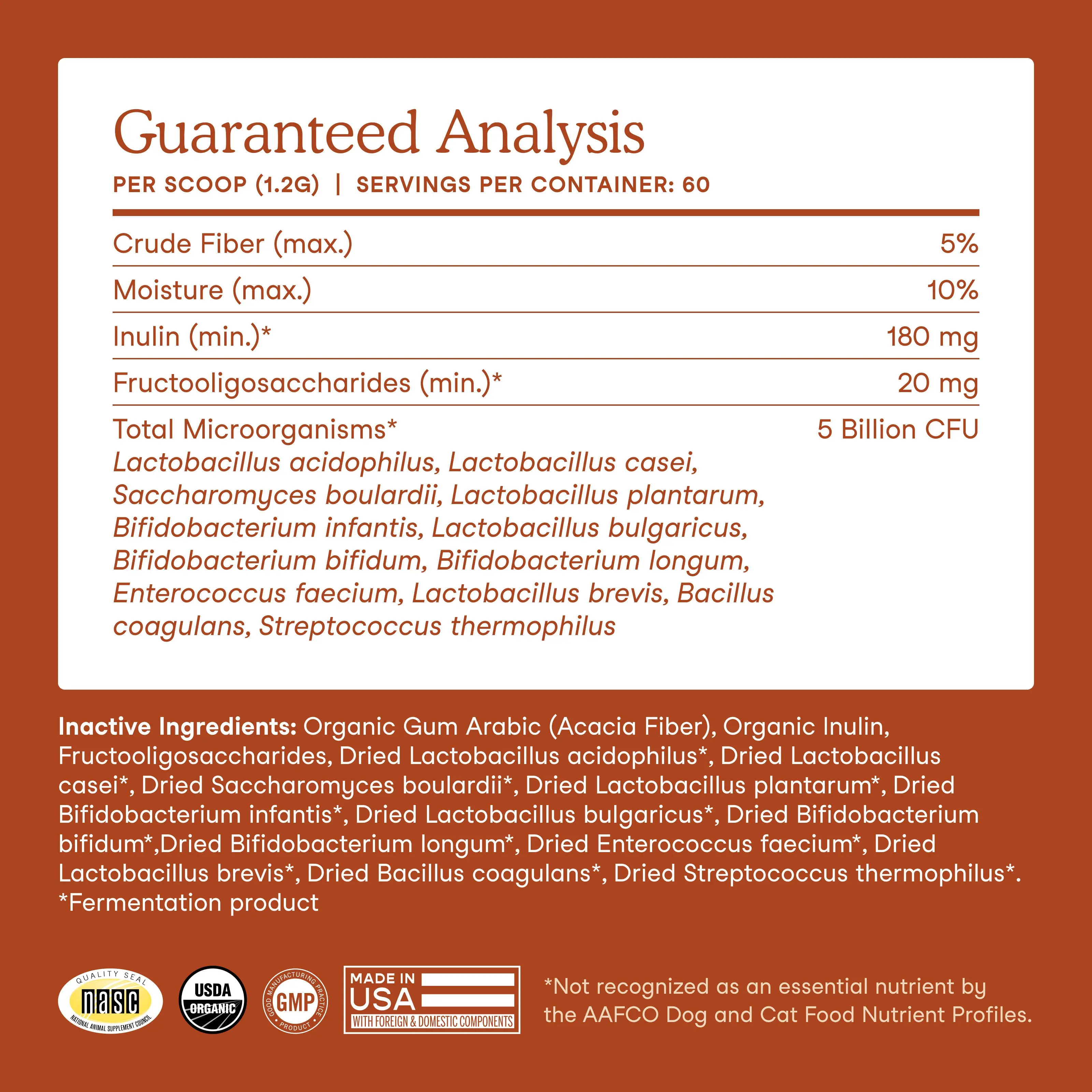 My old probiotic got discontinued and I started using this one, in couple weeks I can see a difference… no more gassy air … dog can relax over night… so and me have fresh air , his poop get very consistent / healthy, also helps in overall health of dog