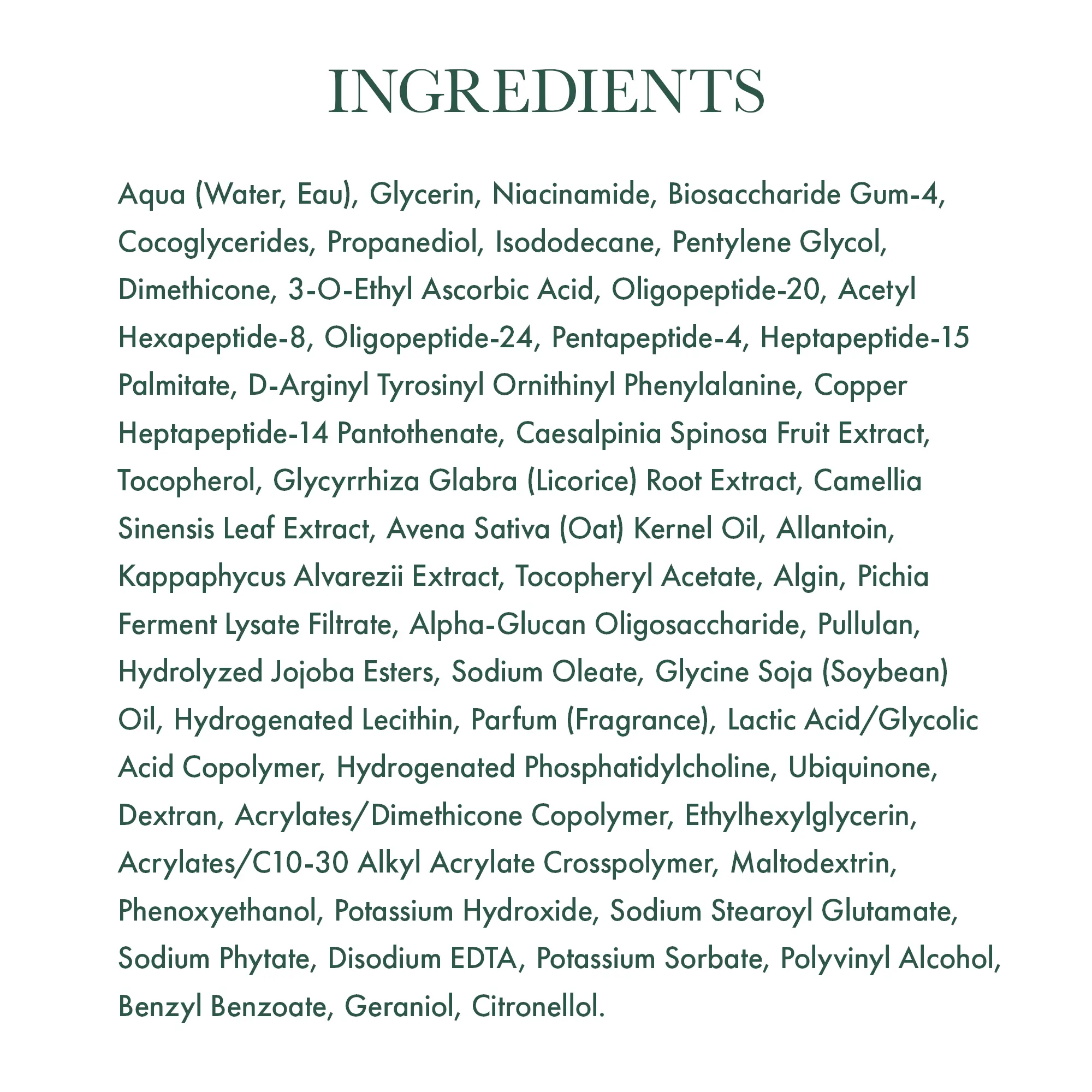 | Ingredients | Aqua (Water,Eau),Glycerin,Niacinamide,Biosaccharide Gum-4,Cocoglycerides,Propanediol,Isododecane,Pentylene Glycol,Dimethicone,3-O-Ethyl Ascorbic Acid,Oligopeptide-20,Acetyl Hexapeptide-8,Oligopeptide-24,Pentapeptide-4,Heptapeptide-15 Palmitate,D-Arginyl Tyrosinyl Ornithinyl Phenylalanine,Copper Heptapeptide-14 Pantothenate,Caesalpinia Spinosa Fruit Extract,Tocopherol,Glycyrrhiza Glabra (Licorice) Root Extract,Camellia Sinensis Leaf Extract,Avena Sativa (Oat) Kernel Oil,Allantoin,Kappaphycus Alvarezii Extract,Tocopheryl Acetate,Algin,Pichia Ferment Lysate Filtrate,Alpha-Glucan Oligosaccharide,Pullulan,Hydrolyzed Jojoba Esters,Sodium Oleate,Glycine Soja (Soybean) Oil,Hydrogenated Lecithin,Parfum (Fragrance),Lactic Acid/Glycolic Acid Copolymer,Hydrogenated Phosphatidylcholine,Ubiquinone,Dextran,Acrylates/Dimethicone Copolymer,Ethylhexylglycerin,Acrylates/C10-30 Alkyl Acrylate Crosspolymer,Maltodextrin,Phenoxyethanol,Potassium Hydroxide,Sodium Stearoyl Glutamate,Sodium Phytate,Disodium EDTA,Potassium Sorbate,Polyvinyl Alcohol,Benzyl Benzoate,Geraniol |