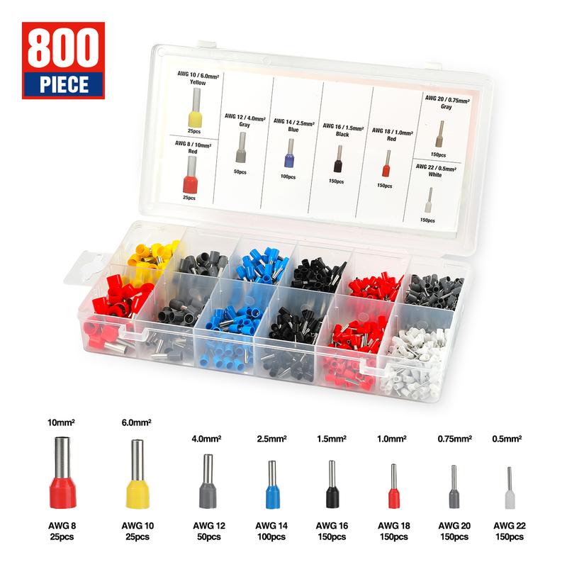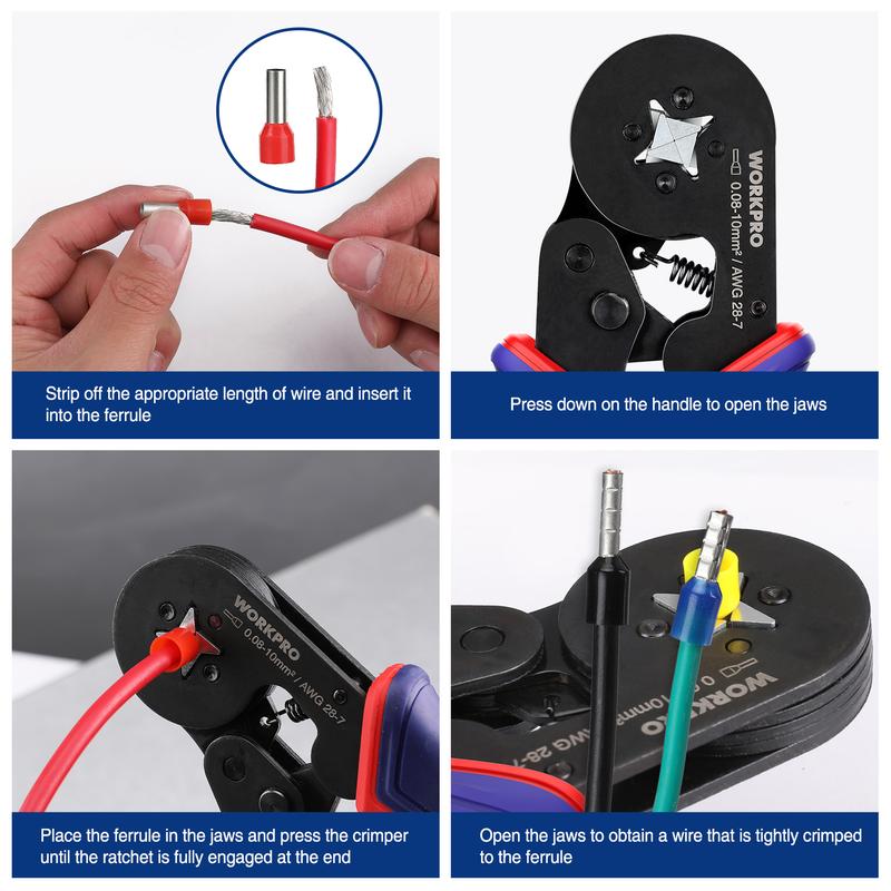 Applicable Wire Gauge: WORKPRO ferrule crimping plier (Quadrilateral) applies to crimp connectors from 0.08 to 10 mm² (AWG 28-7). 800 counts Wire Ferrules for AWG 22-8.