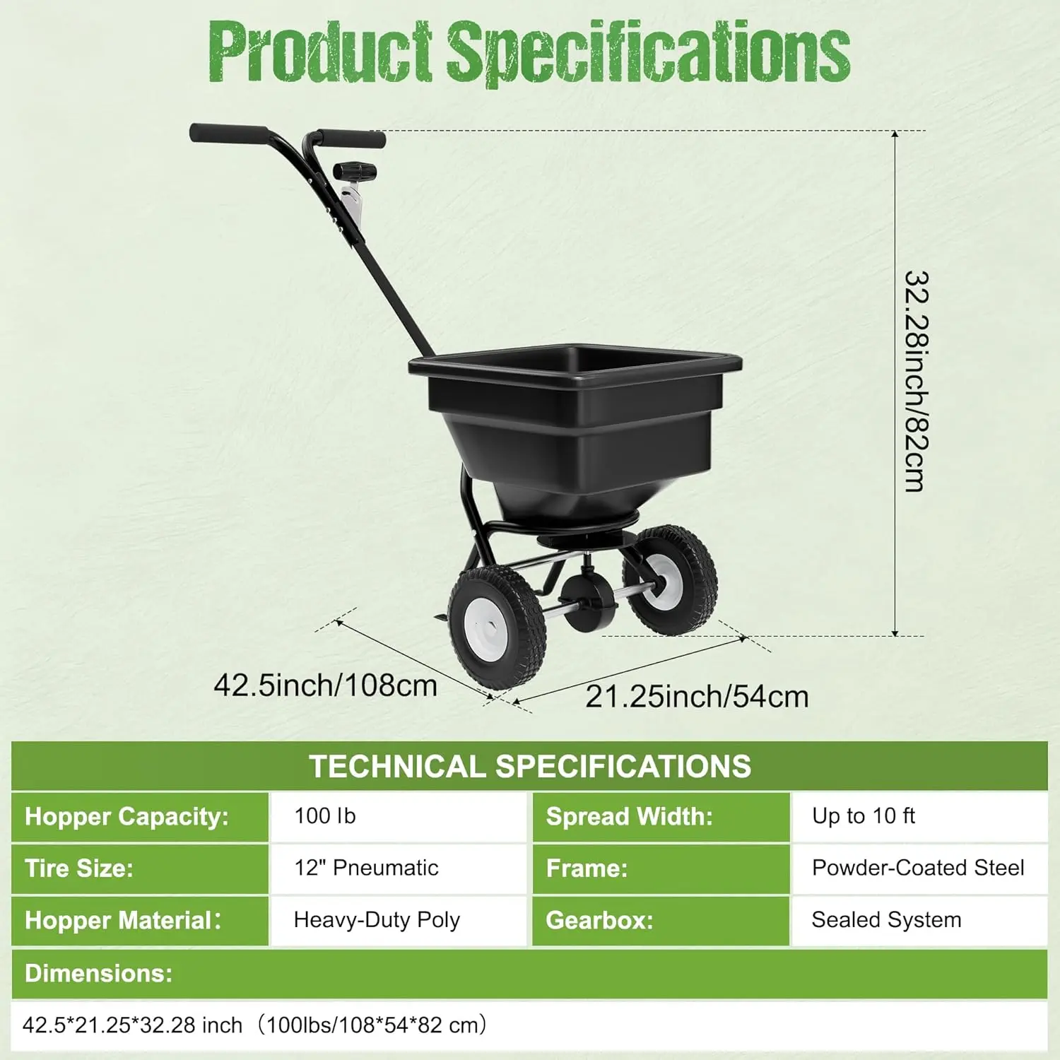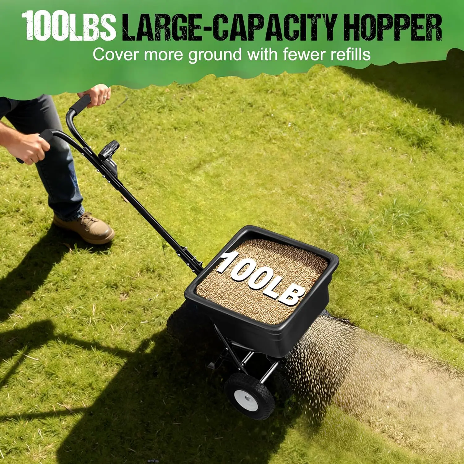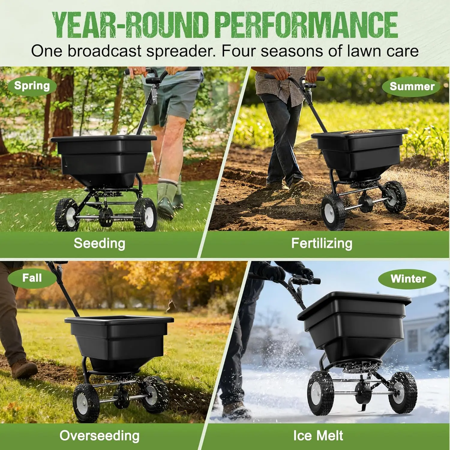 ·100LB Capacity & All-Season Use: This high-capacity spreader features a 100LB hopper, ideal for large-area coverage with fewer refills. Perfect for spring seeding, summer fertilizing, fall lawn care, and winter salt spreading. 🌞❄️