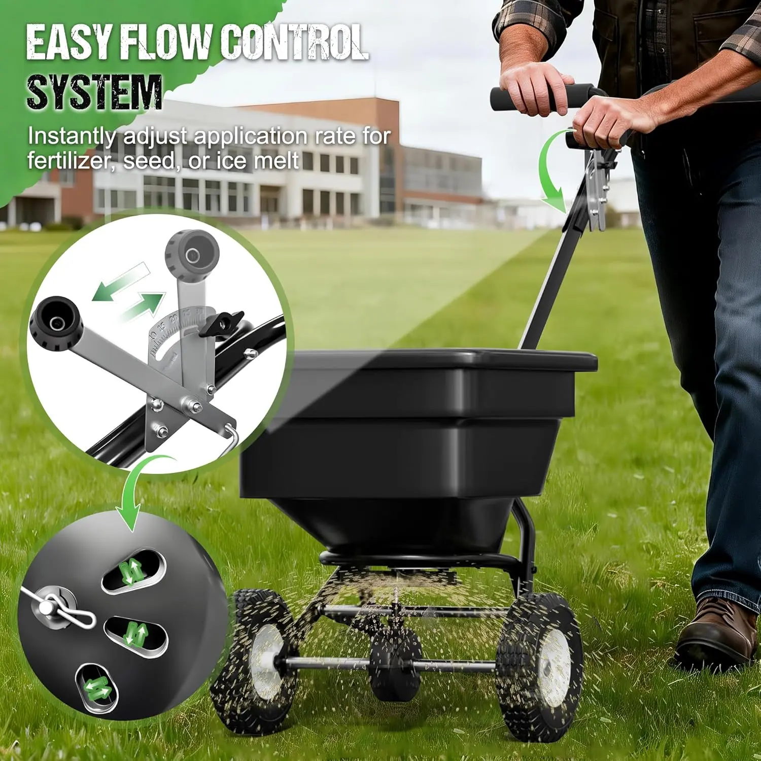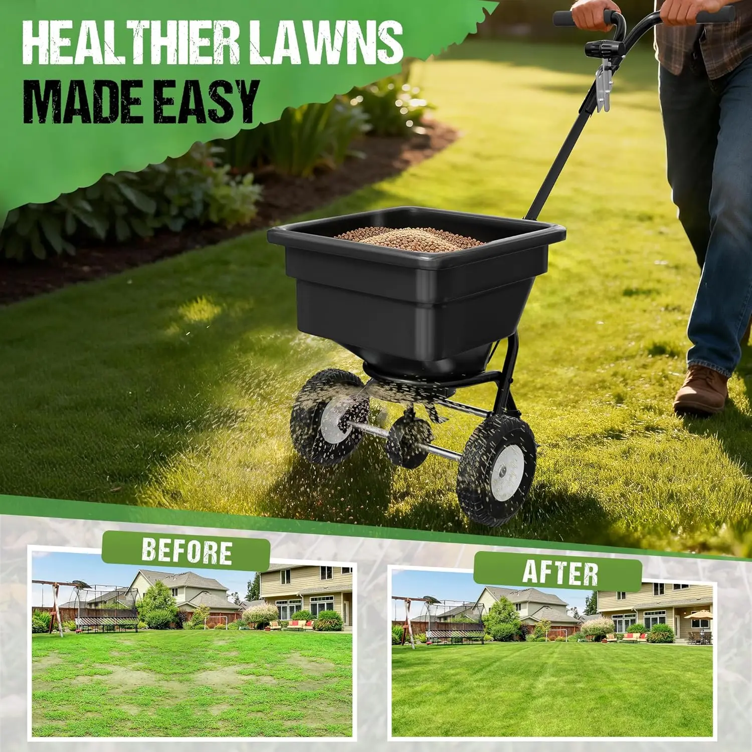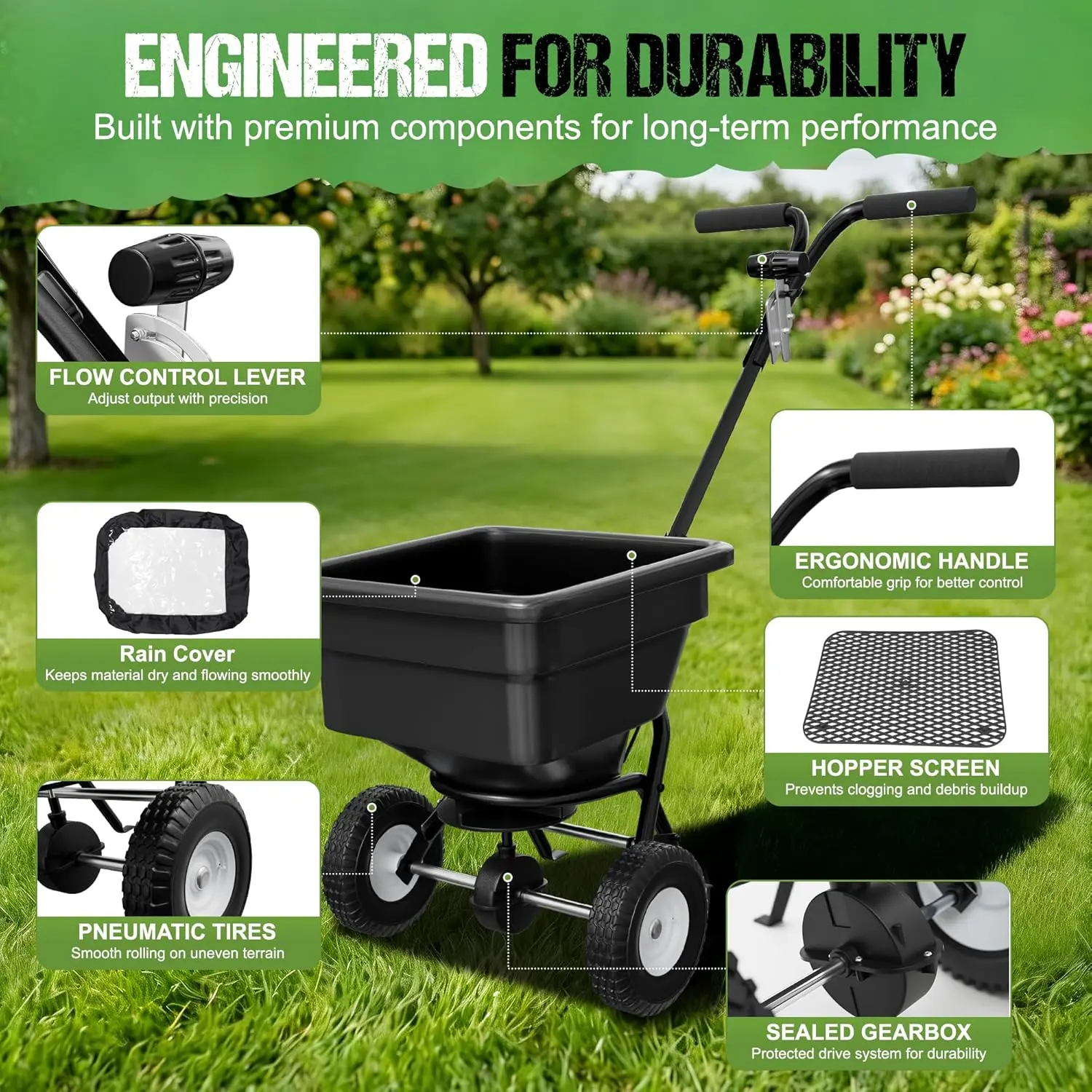 ·Ergonomic Design: Equipped with 12-inch pneumatic tires and an ergonomic handle, this spreader moves easily across lawns, sidewalks, gardens, and uneven terrain. Provides comfort and control during extended use. 🚶♂️