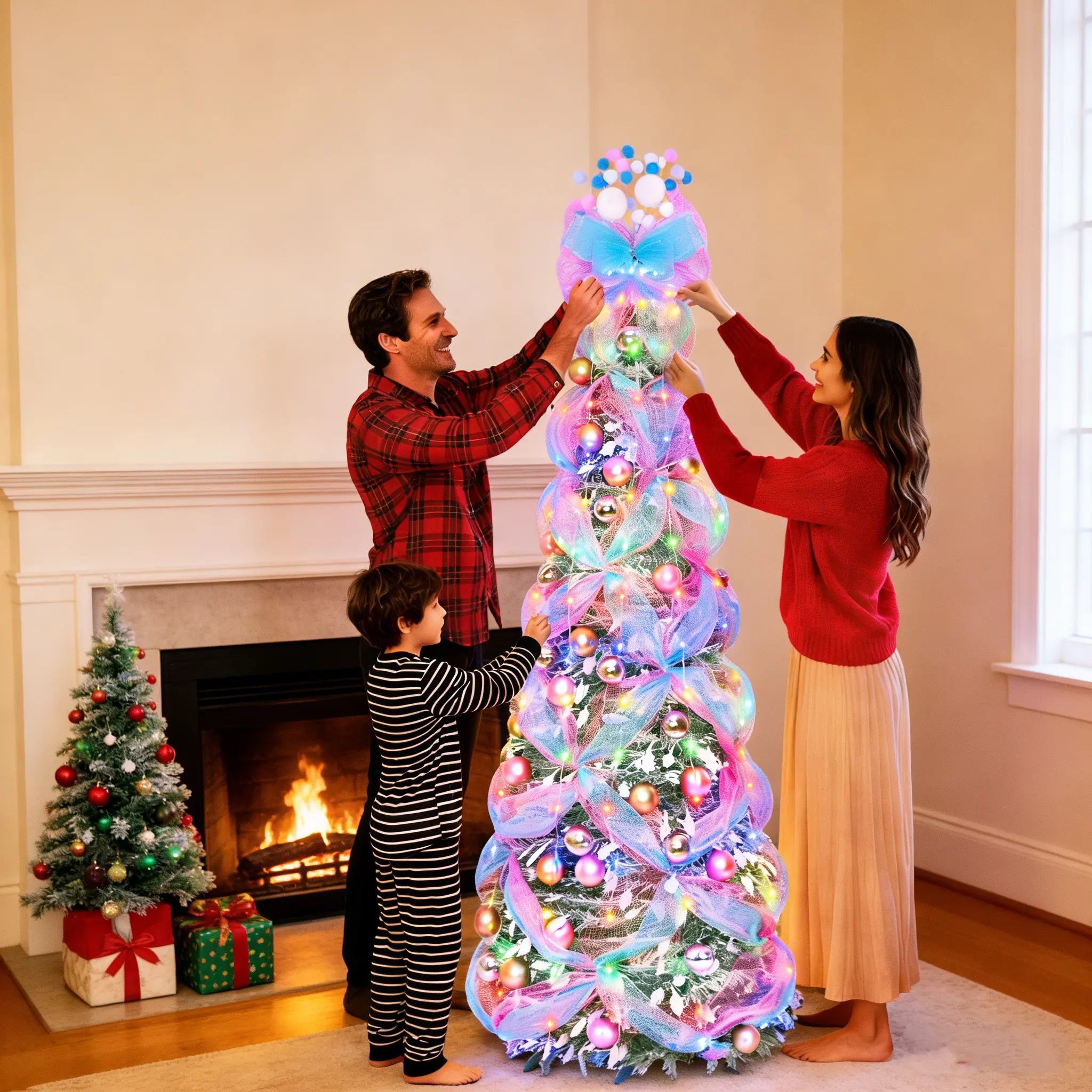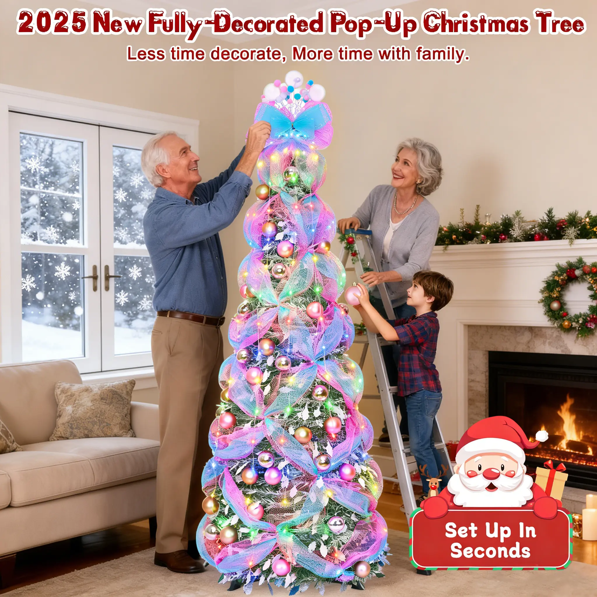 Does NOT come decorated (except for the riibbon which is smashed and creased) will be a LOT of work to decorate. You have to put the lights on it too. The remote doesn't work, so you cannot dim the lights, just super bright seizure inducing strobe lights. Very disappointing ☹️