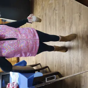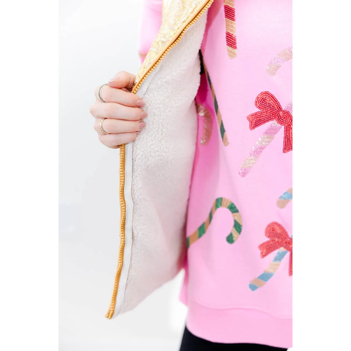 ·Details:Fully sequin exterior for maximum holiday shimmerSoft, cozy inner lining for comfort and warmthZip-front closure for easy layeringGold finish that pairs effortlessly with all winter looksPerfect for parties, gifting, and festive events