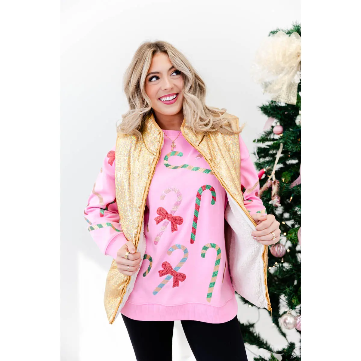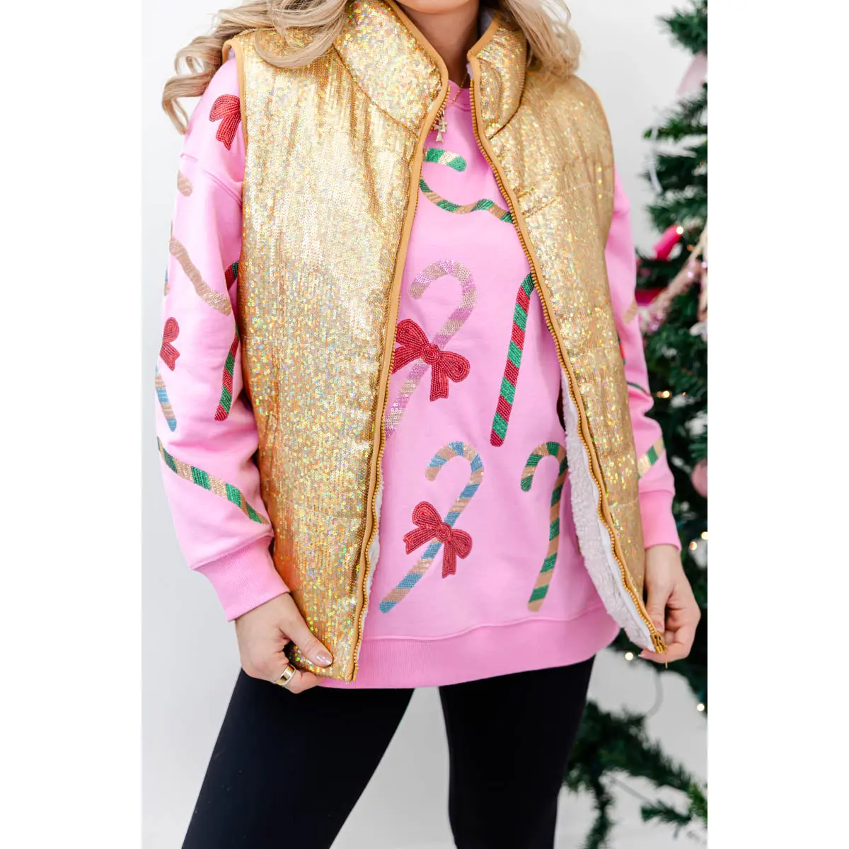 ·Light up every holiday moment with our Festive Glow Sequin Vest. Designed with stunning gold sequins that catch the light from every angle, this vest brings instant glamour to any outfit. Whether you're layering it over your favorite holiday sweatshirt or adding a touch of sparkle to a simple top, it’s the perfect statement piece for the season.