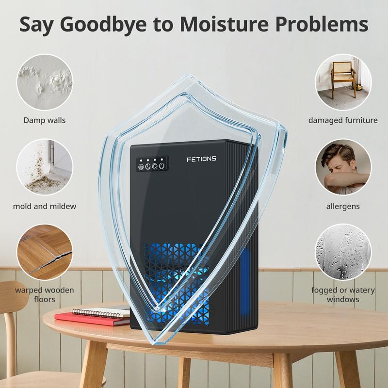·High-Efficiency Dehumidification & Smart Design:The Fetions Dehumidifier utilizes advanced condensation technology, capable of absorbing an average of 40 oz (approximately 1180 ml) of excess moisture per day (tested at 86°F and 85% RH). Even in high-humidity environments, it efficiently reduces moisture levels, helping to maintain a fresh and dry indoor atmosphere.