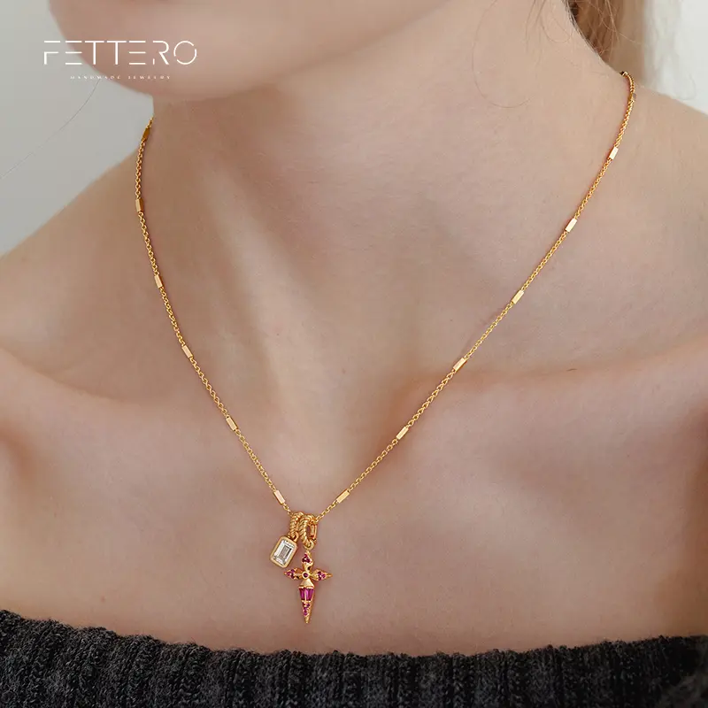 Elegant 14K gold plated necklace featuring stunning pink sapphires and sparkling crystals. This unique multi-charm pendant design combines classic cross elements with modern fashion, showcasing feminine elegance and sophistication.