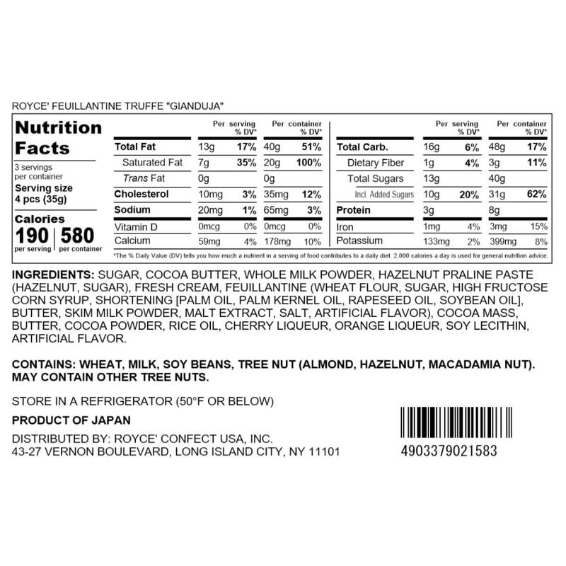 | Ingredients | COCOA BUTTER,WHOLE MILK POWDER,HAZELNUT PRALINE PASTE,HAZELNUT SUGAR,FRESH CREAM,FEUILLANTINE,WHEAT FLOUR,HIGH FRUCTOSE CORN SYRUP,SHORTENING,PALM OIL,PALM KERNEL OIL,RAPESEED OIL,SOY OIL,BUTTER,SKIM MILK POWDER,MALT EXTRACT,SALT,ARTIFICIAL FLAVOR,COCOA MASS,COCOA POWDER,RICE IL,CHERRY LIQUEUR,ORANGE LIQUEUR,SOY LECITHIN,WHEAT,MILK,SOYBEANS,TREE NUT,HAZELNUT |