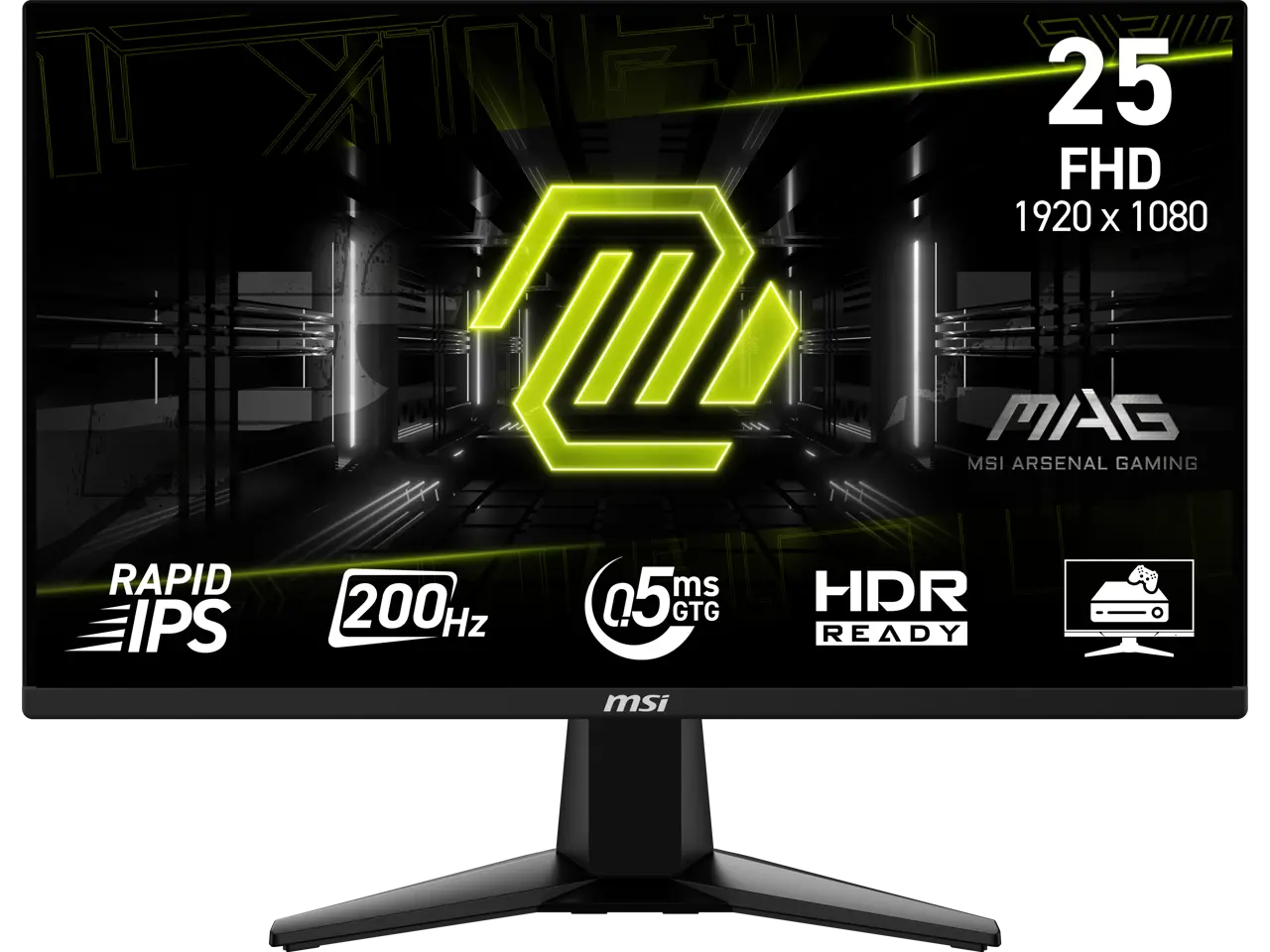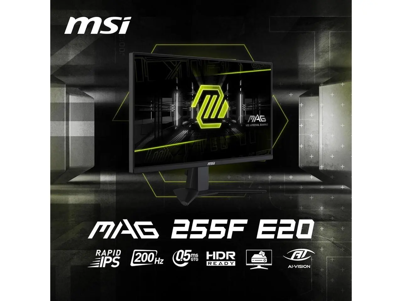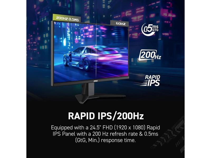 Experience immersive gaming with the MAG 255F E20 gaming monitor. It features a 1920x1080 (FHD) panel, a 200Hz refresh rate, and a rapid 0.5ms (GtG, Min) response time. The monitor is HDR ready, enhancing eye-catching details through adjustments in contrast and shadows. Designed for competitive FPS, first-person RPG/MMORPG, and flight/racing simulator genres, the MSI MAG 255F E20 Gaming Monitor takes casual gaming to a new level, challenging players to see beyond the game.MAG MSI Arsenal GamingMSI's mainstream MAG series epitomizes stability and durability and is built to withstand the most intense gaming sessions. The entire lineup features robust construction with metallic-like hardness and excellent heat dissipation, ensuring stability for all critical gaming components.Smooth Rapidity and AccuracyEquipped with a 200Hz refresh rate and 0.5ms (GtG,min) response time which has the benefit in fast moving game genres such as first person shooters, fighters, racing sims, real-time strategy, and sports.See Clearly, See Comfortably.Anti-Flicker and Less Blue Light technologies provide a very comfortable viewing experience by reducing the amount of flicker and displaying lower levels of blue light. You can game for longer periods without experiencing eye fatigue.Tear Free, Stutter Free Fluid GamingGaming shouldn't be a choice between choppy gameplay and broken frames. With the MSI gaming monitor, you'll experience fluid, artifact-free performance. Enjoy tear-free and stutter-free gameplay with added support for HDR.AI VisionThe new Al Vision technology can not only reveal details in dark areas but also enhance overall brightness and saturate colors, bringing brightness to your day.