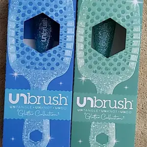 FHI Heat 2pc Glitter Turquoise & Sapphire UNBrush Detangling Brush Set What It Is UNBrush gently and effortlessly extracts knots and tangles from even the unruliest hair. With 105 dual length bristles and an ultralight high-performance handle, it helps reduce styling time and prevents hair from catching. Great for wet and dry hair!  What You Get UNbrush Detangling Brush - Glitter Turquoise UNbrush Detangling Brush - Sapphire What It Does Ultra-light, high performance handle weighs only 1.5 oz. Offers durable flexibility and ease of use 58 long and 47 mini DuoFlex Anti-Static Bristles help gently release tangles and reduce breakage Unique backless vented cushion has been shown to reduce drying time Can be used on wet or dry hair and all types of hair