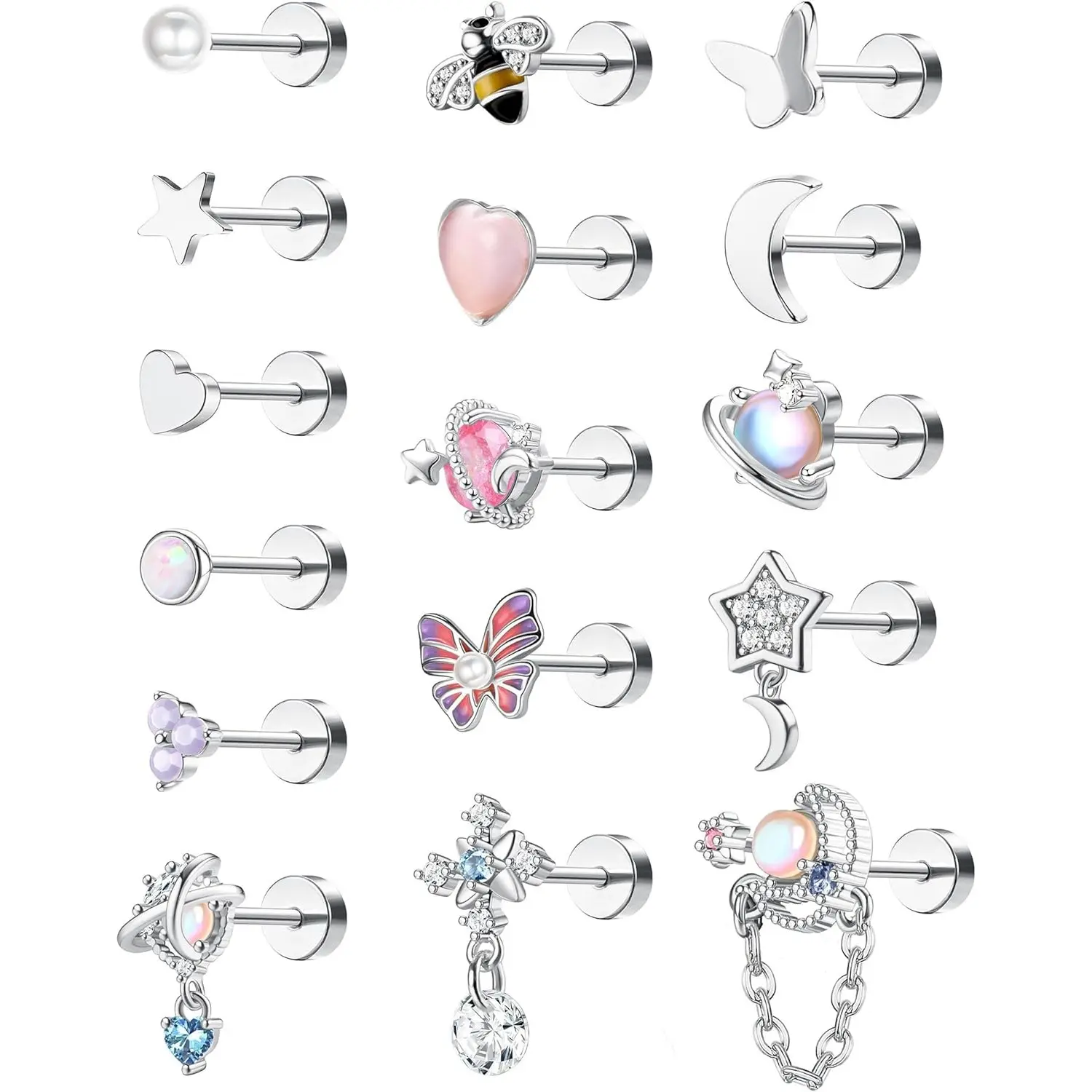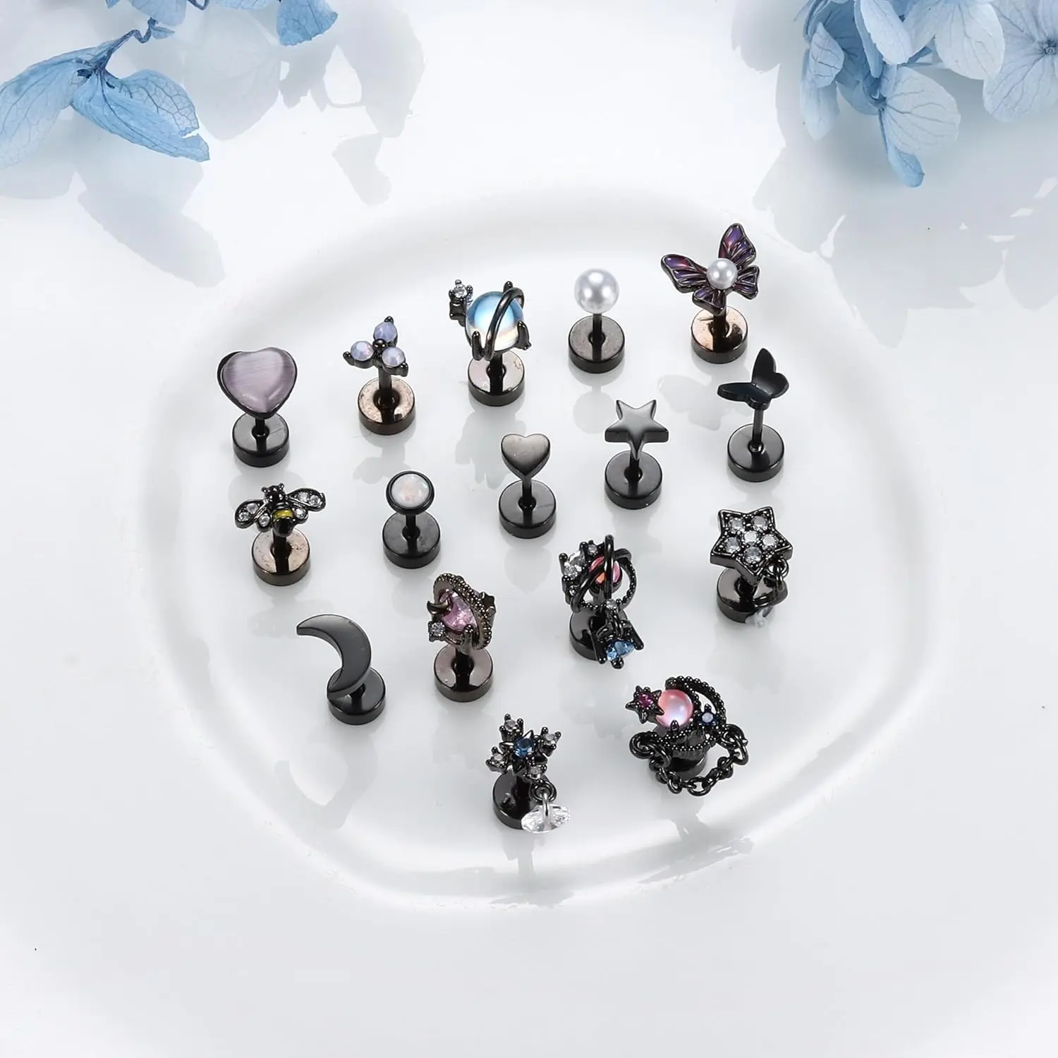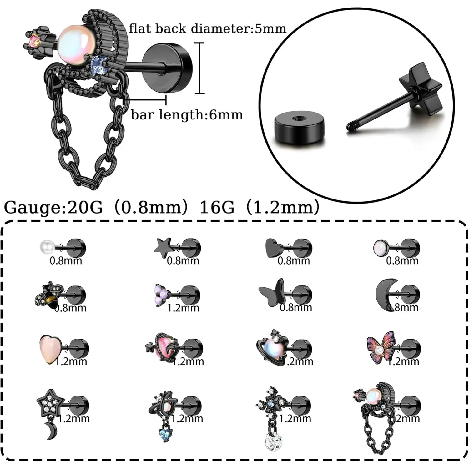 ·【Economical Cartilage Earrings Set】:You can get 16pcs stainless steel cartilage piercing jewelry for women with one order,including opal heart tragus earrings,dangle CZ moon tragus piercing jewelry,butterfly screw back earrings,etc.There's enough different styles to match any outfit or costume you are wearing.