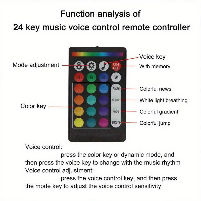 Remote mode: Static 16 color (red, green, blue, yellow, mixed white, pure white, cyan, purple, etc.) and RGB light change, fade, jump, spark and adjust brightness, mode speed and sound sensitivity adjustment.