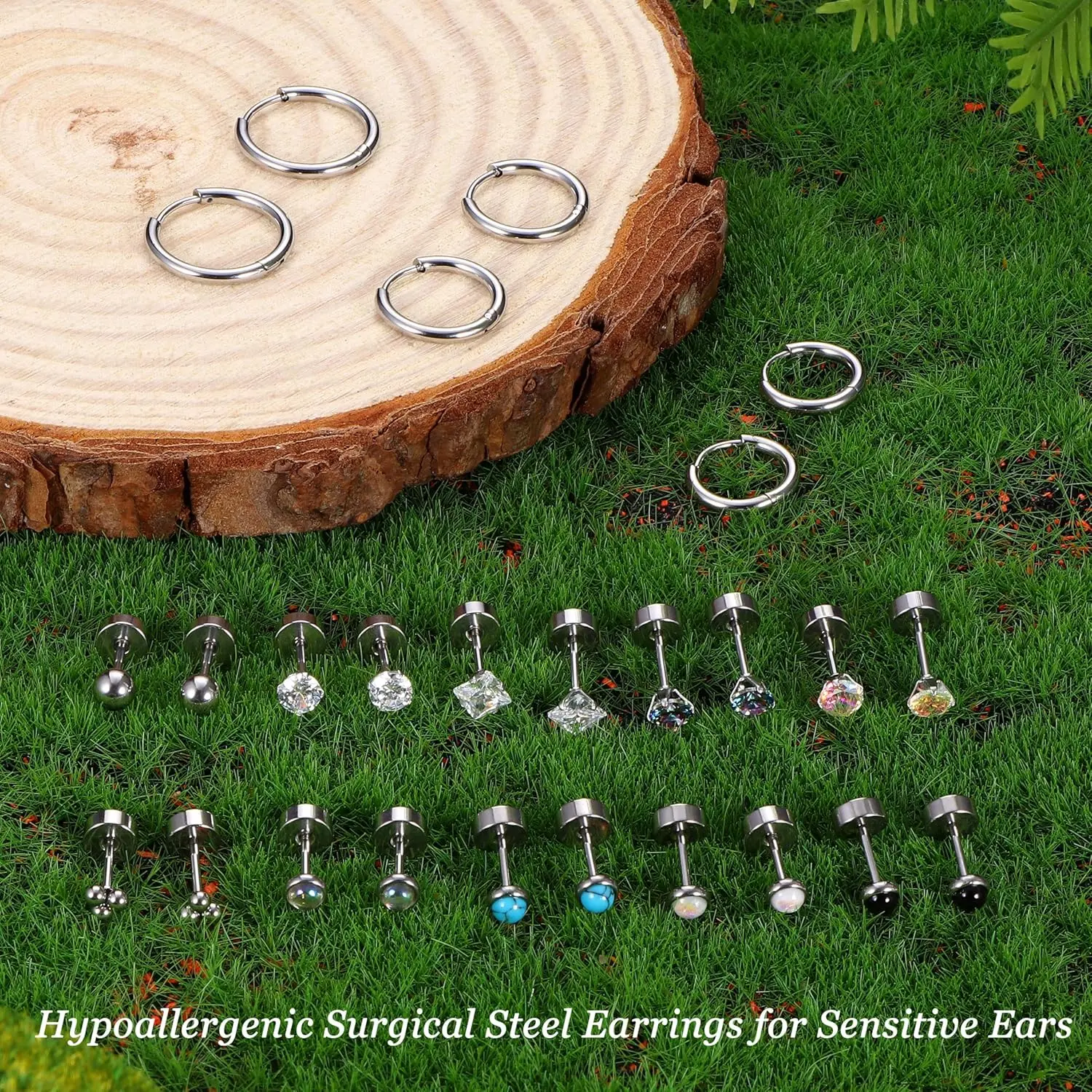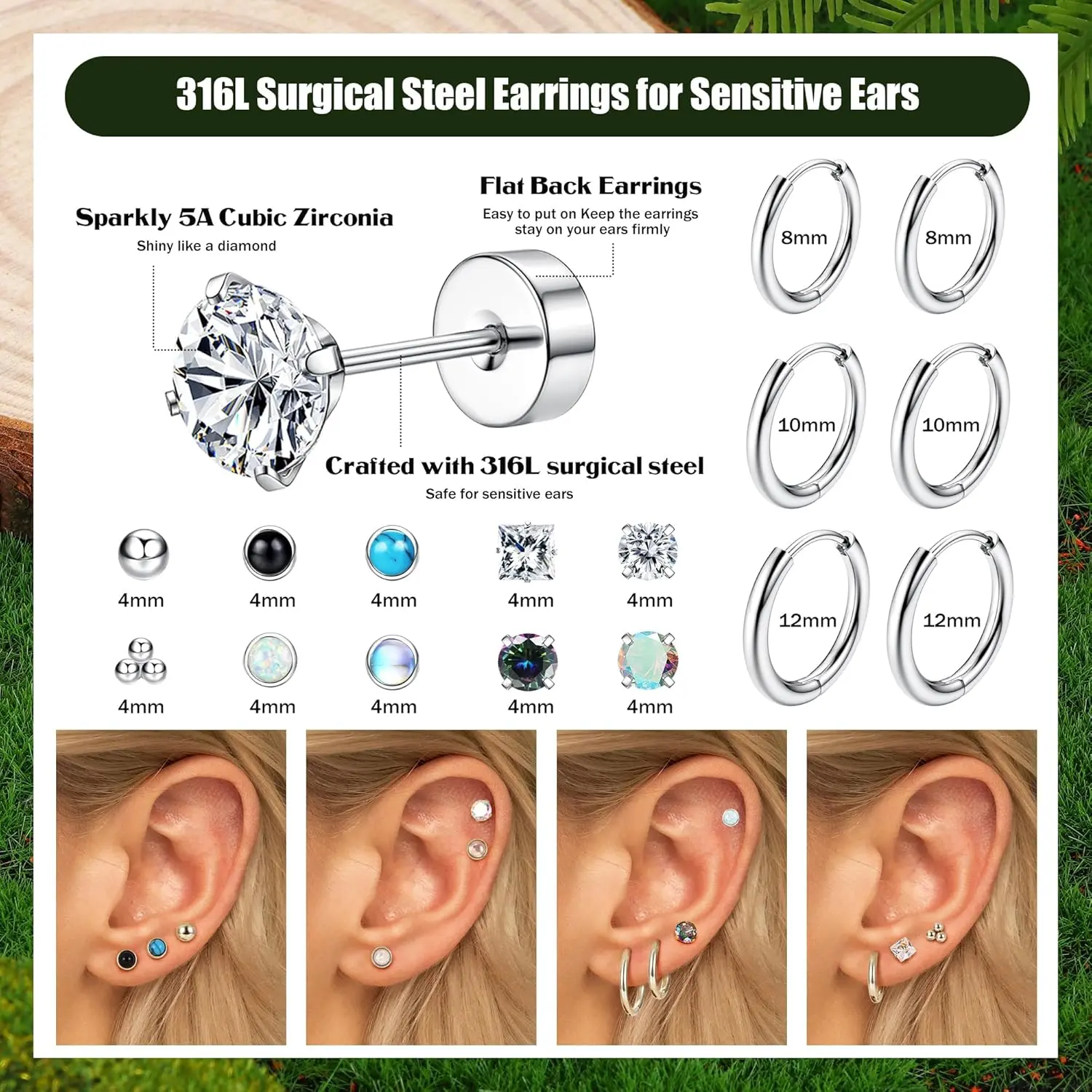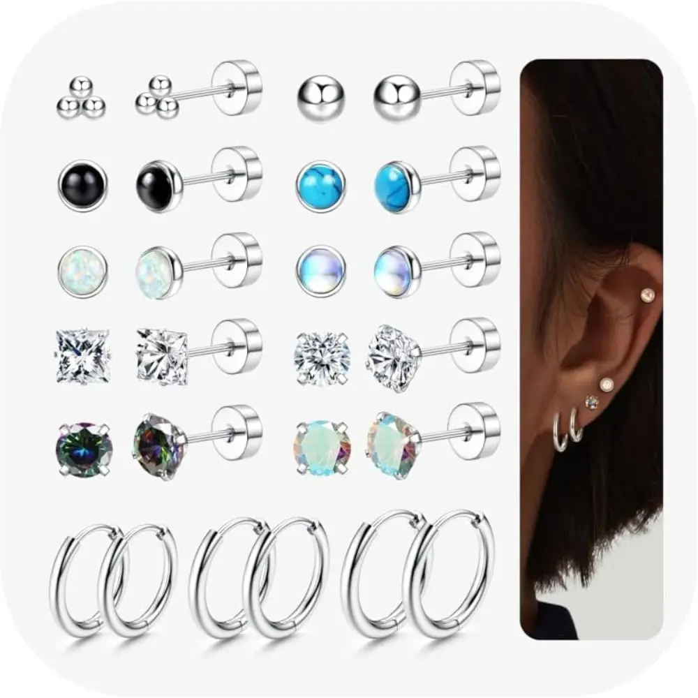 ·Flat Back Earrings for Women: The 316L surgical steel earring set for multiple piercings includes silver stud earrings, small silver hoop earrings, surgical steel earrings, zirconia opal ball stud earrings, flat back earrings, cartilage earrings set, among others. Different styles of hypoallergenic earrings can suit your daily wearing style. Hypoallergenic surgical steel earrings can be worn for a long time and are ideal for people with sensitive ears.