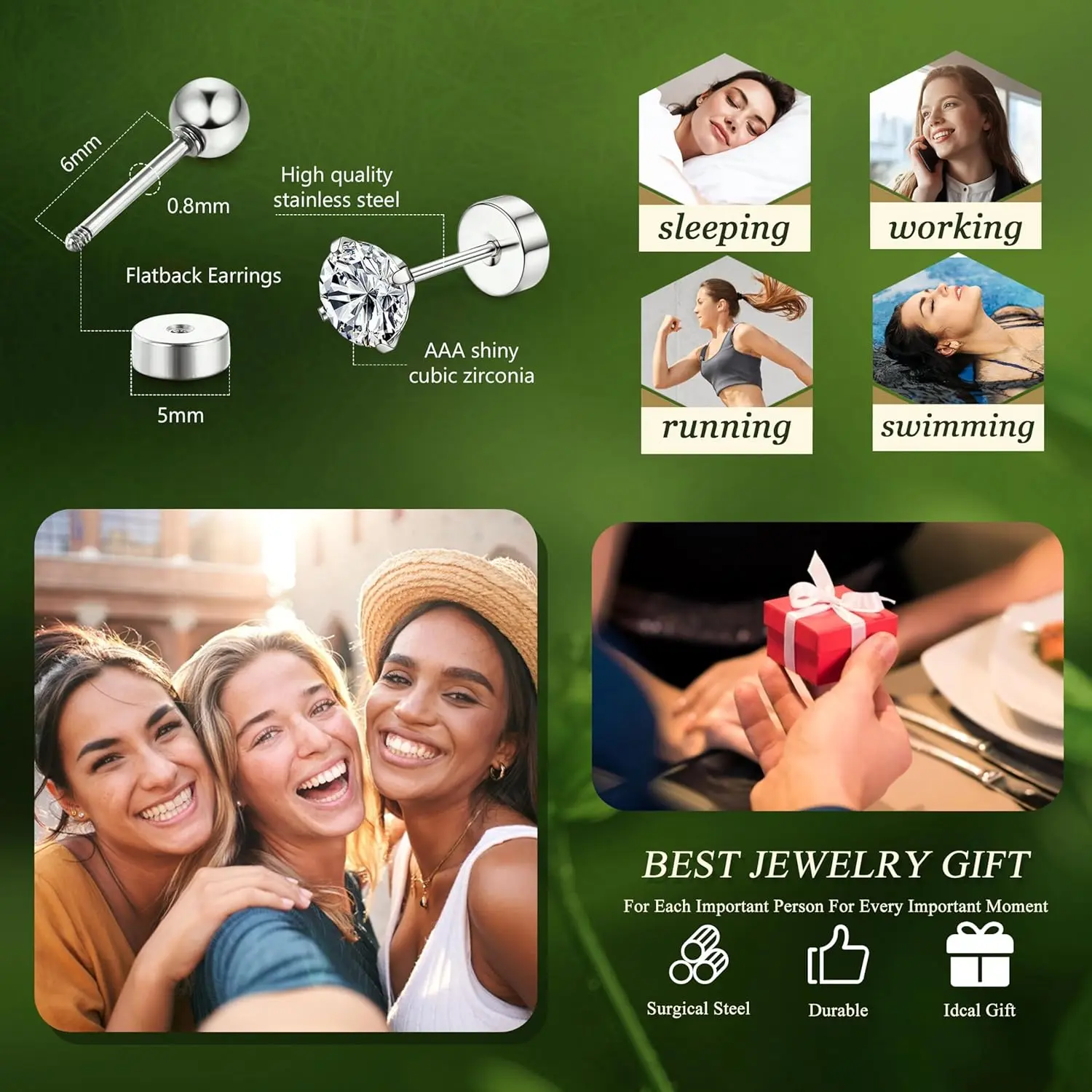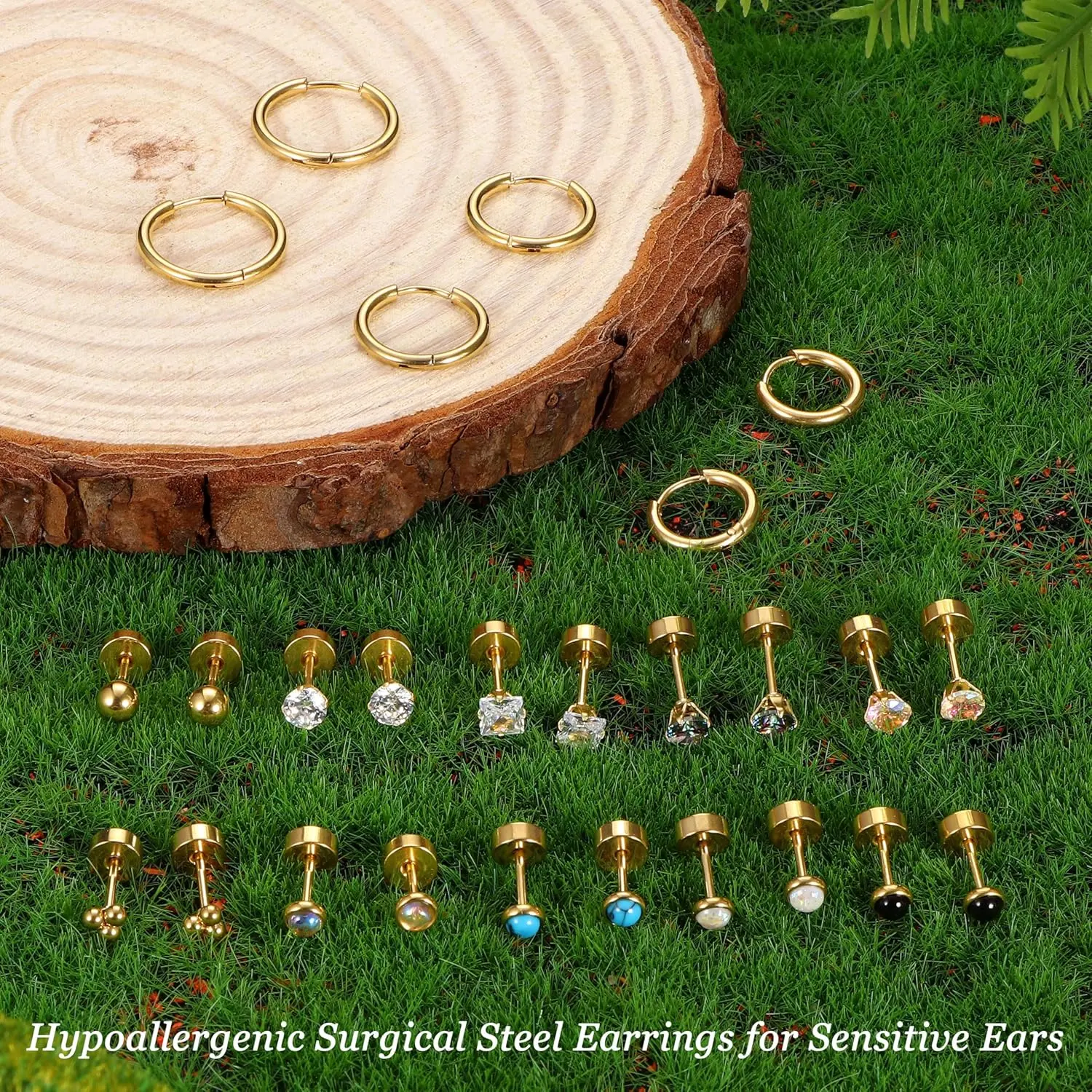 ·Surgical Steel Earrings for Women: Hypoallergenic earrings are available in a variety of styles and design options. Flat back earrings thickness: 0.8mm. Silver hoop earrings Inner diameter: 8/10/12mm. Surgical steel earrings are available in cubic zirconia, pearl, opal, and turquoise. These stud earrings are designed to be flexible and suitable for a variety of piercing locations. Whether you have piercings in your earlobes, helixes, or elsewhere, these earrings can cater for a wide range of needs.