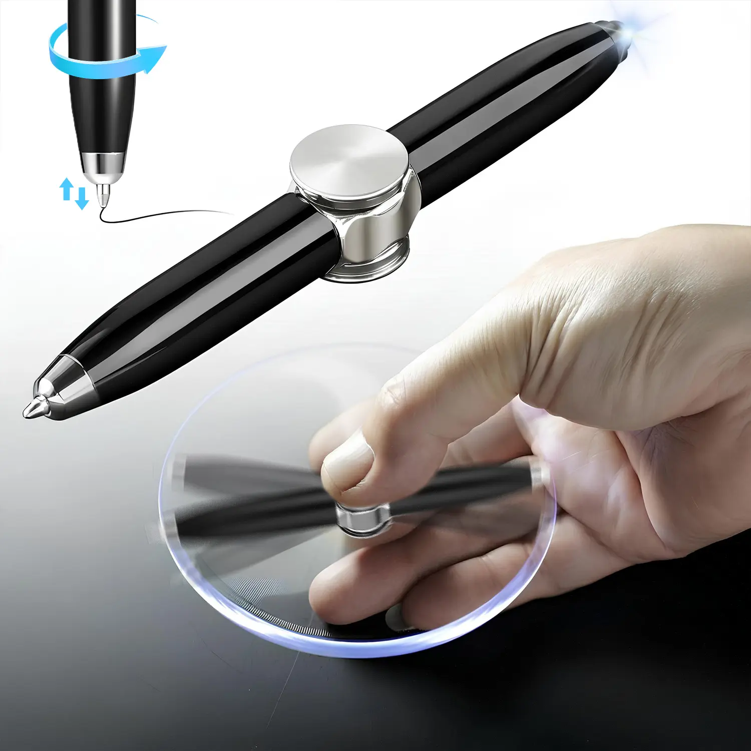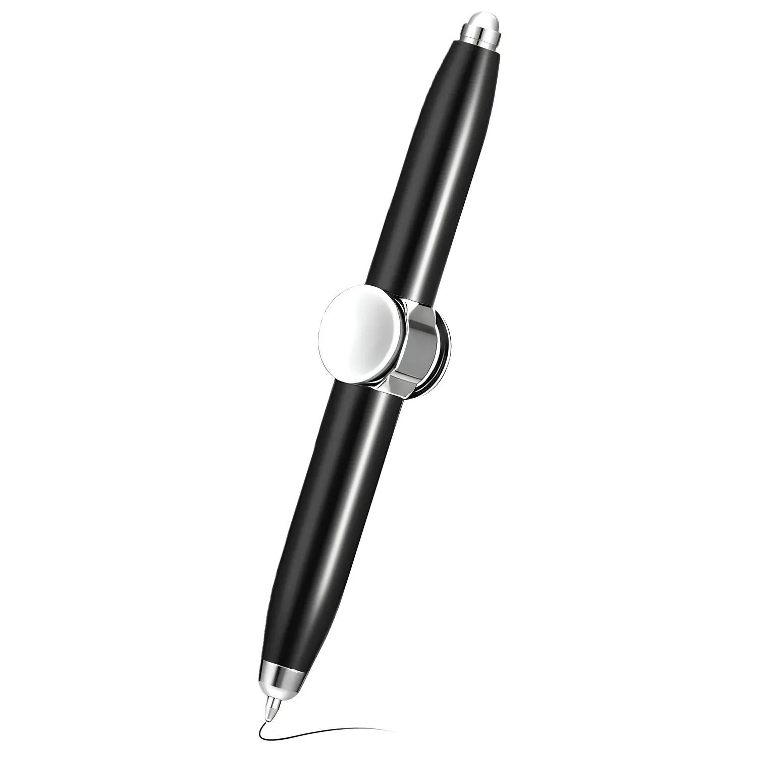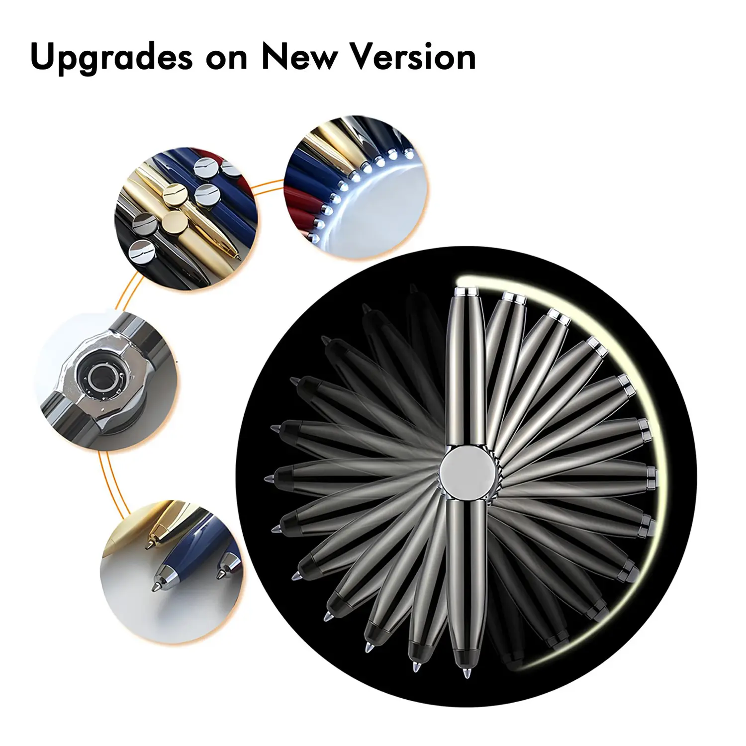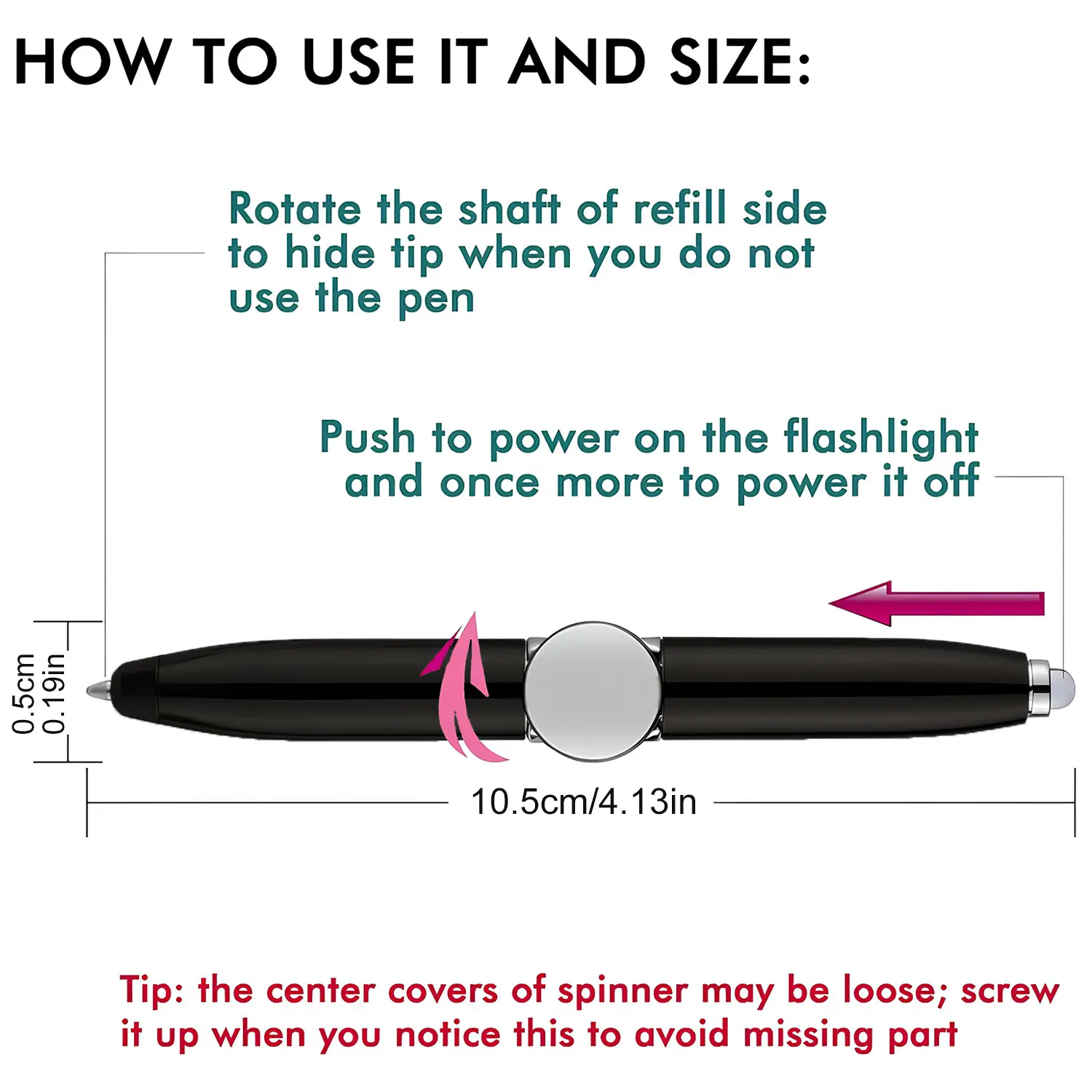 CONSTRUCTION: The body material is machined from stainless steel material with non-toxic painting; the spinning is made from alloy, not PLASTIC, and much heavier on this upgraded version of the fidget spinning pen. The pen is a 3-in-1 fun playing fidget pen with a flashlight, and regular ballpoint pen.