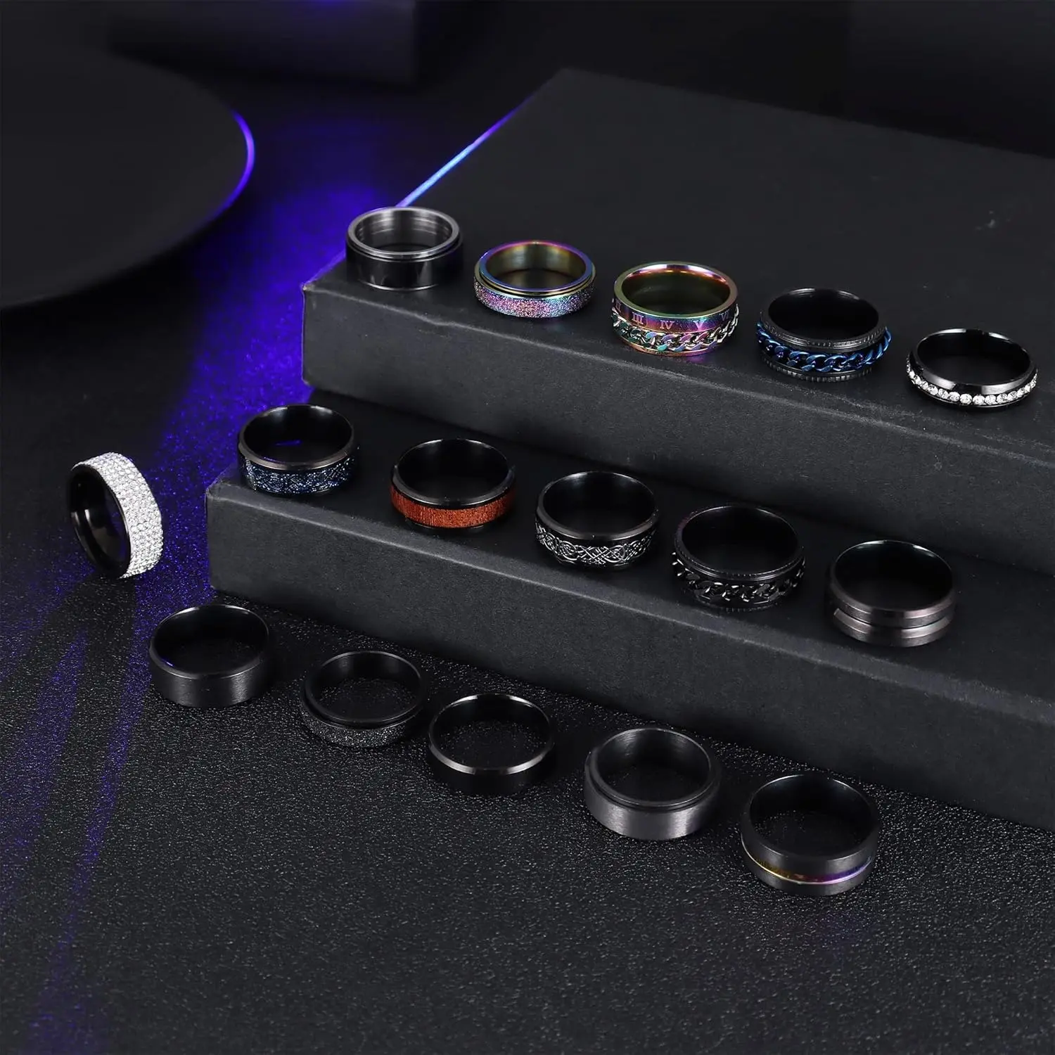 Shape:biker chain spinner ring, Wheel Rings, pure black ring, inlaid colored, smooth and frosted band ring