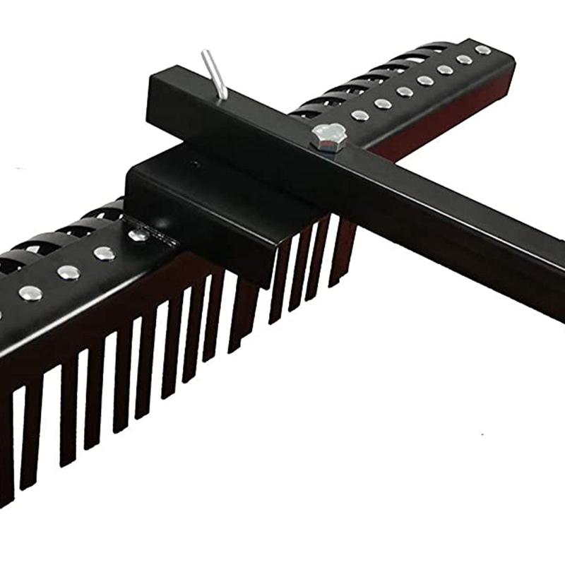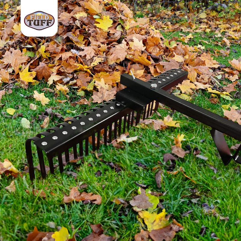 Grooming your lawn and removing rocks and sticks, the Field Tuff Sleeve Hitch Landscape Rake drags behind your lawn tractor to clear away debris.Fitting to the sleeve hitch on your lawn tractor or riding mower, the rake drags 24 heat-treated tines along the ground, collecting debris and pulling it off your lawn or breaking up clods of sod. Designed with a 24-degree angle for easy windrowing, the tow-behind rake lets you work along fences, walls, and other objects, cleaning your whole landscape. Built for use with sleeve hitches, the rake attaches securely to your vehicle for solid, reliable work. 48 inches of working width easily rid your lawn of yard waste. Made from heavy-duty steel and sporting a durable black coating that resists rust and corrosion, providing the rake with a strong, reliable design.Easily clean your lawn and break up dirt and sod on your land. Designed with reliability in mind, the Sleeve Hitch Landscape Rake by Field Tuff keeps you yard looking beautiful year-round.