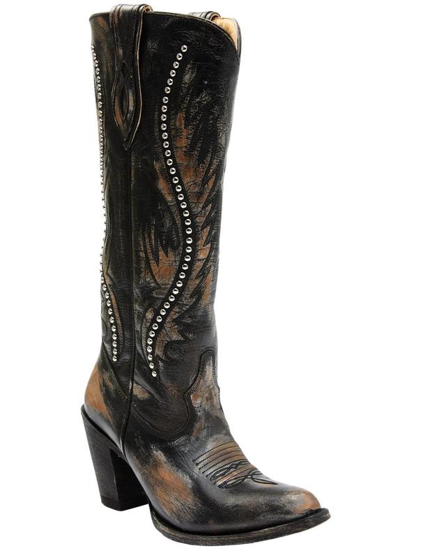 Full-grain leather. Pull tabs. Round toe. Leather lining. Cushioned footbed. Studded embellishments. Leather outsole. Western heel. Handcrafted by highly skilled boot artisans. 15" shaft height.
