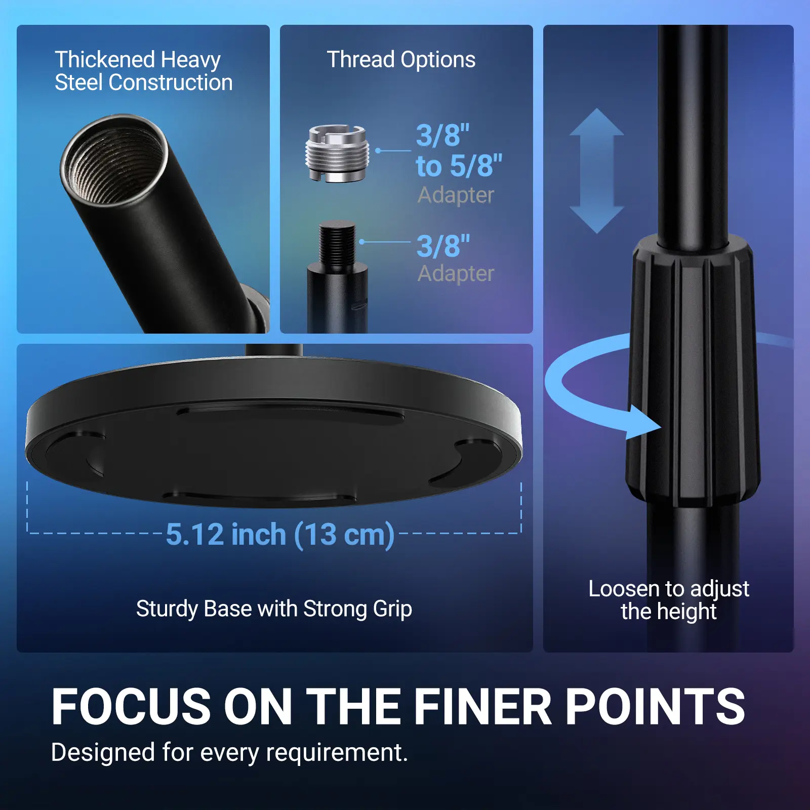 ·[Bearing Strength] Our all-metal construction desktop mic stand delivers both exceptional durability and impressive load-bearing capacity-supporting mic up to 11 lbs (5 kg) with ease. Even premium mics stay firmly in place-no wobbling, slipping, or accidental drops.