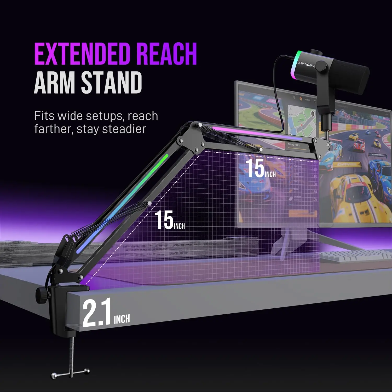 ·[Vibrant RGB System] Experience immersive 240+ RGB combos of mic and boom arm . Select beat modes that the computer microphone pulses to horror game soundtracks, dialing up chilling tension. The arm stand glowing pair with the boom mic lighting enhances explosions via flowing modes or maintains strategic focus via cool tones by controlling RGB button.