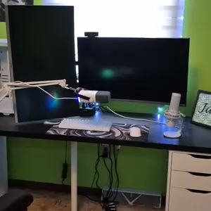 Desk clamp features an anti-scratch pad and fits desktops up to 2 inches thick; position and angle are fully adjustable.