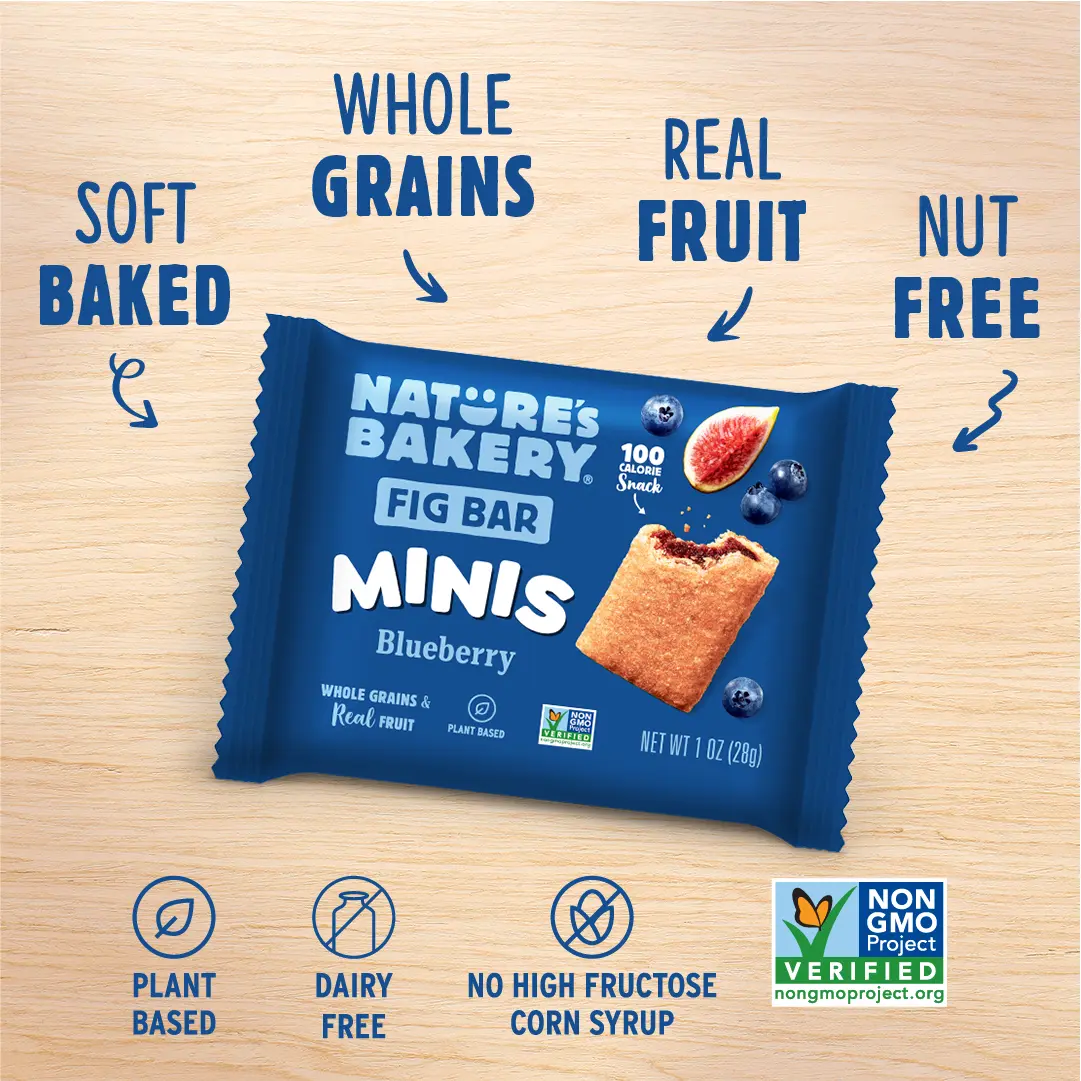 Soft baked snack. 100-calorie pack! Perk up your pantry with perfectly portioned Fig Bar Minis made with real fruit and wholesome whole grains. Plant based, dairy-free, nut-free, and 100% delicious!
