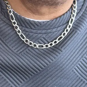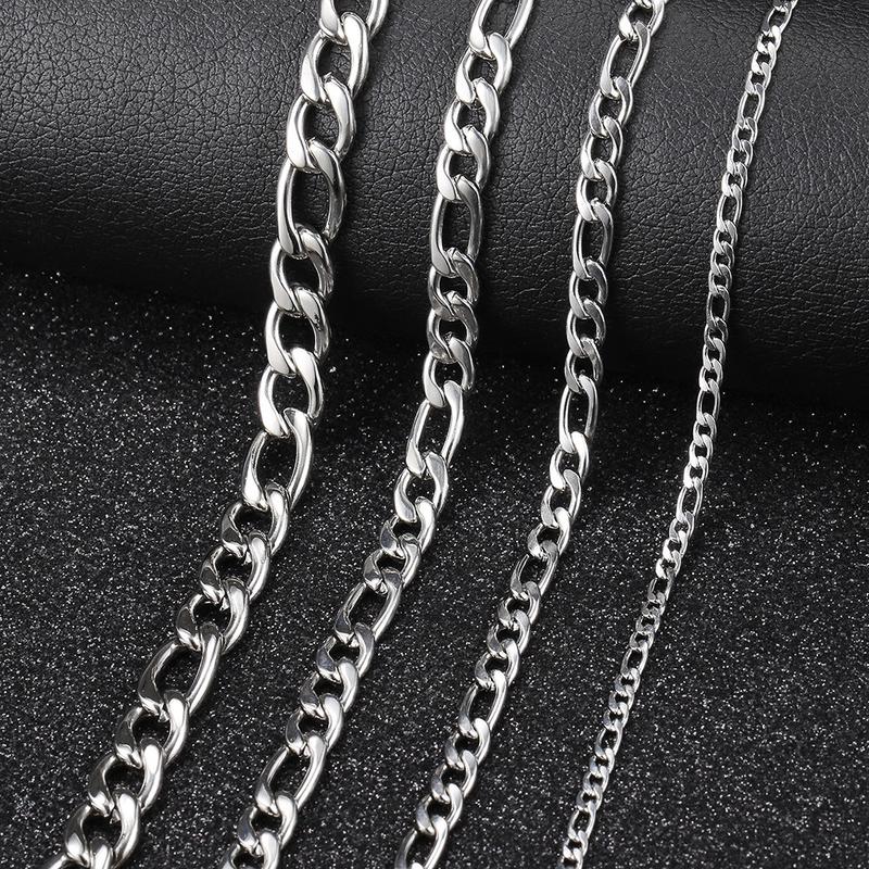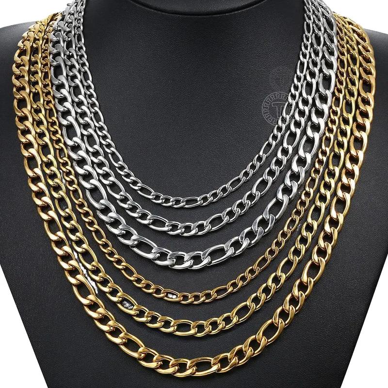 This is for either a 3mm, 5mm, 7mm, 9mm Silver or Gold Color Stainless Steel Figaro chain necklaces from 16 inches to 30 inches. Stainless Steel will not tarnish nor discolor easily.