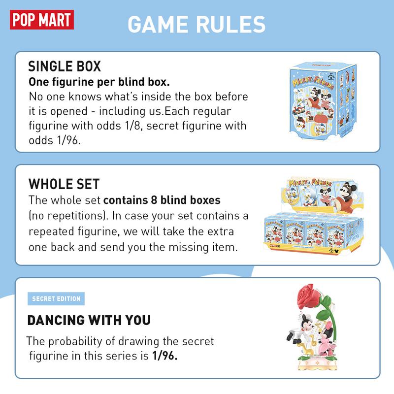 ·Blind Box: All items are figurine products with different designs. Each box contains one random design for value of 16.99 USD, and comes in a sealed box with no one knows what's inside-including us. This whole collection contains 8 regular figurine products (Odds: 1/8), and 1 secret edition(Odds:1/96).