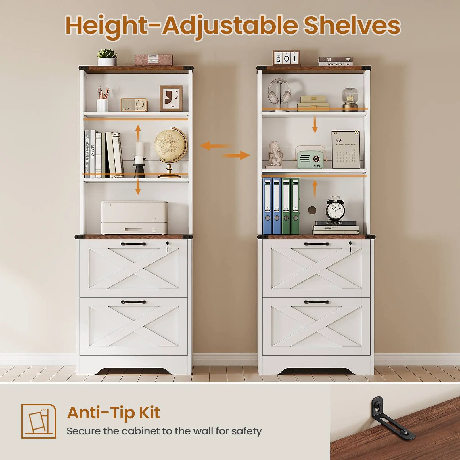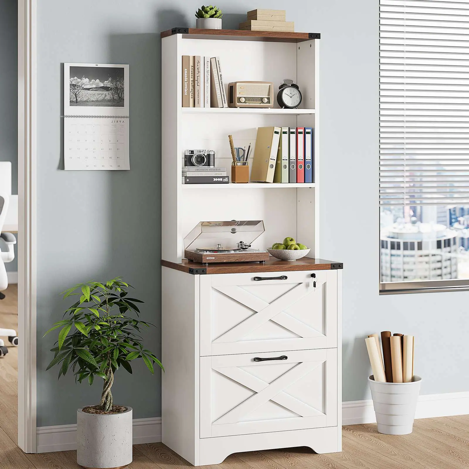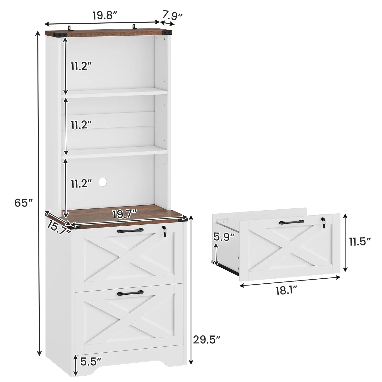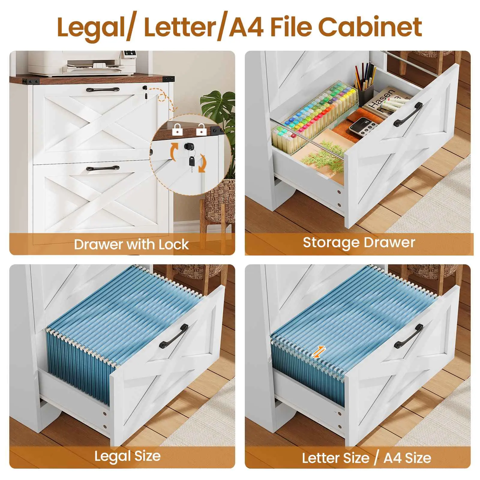 โ€ข Ample Storage: 19.7"L x 15.7"W x 65"H, shelves hold files, printers, and more. โ€ข 2 Drawer File Cabinet: Supports letter, legal, and A4 hanging files. โ€ข Multi-Purpose Use: Functions as a file cabinet, bookshelf, printer stand. โ€ข Farmhouse Style: Sophisticated design adds charm to your home. โ€ข Easy Assembly & Safety: Labeled parts, anti-tip kit included, and after-sales service.