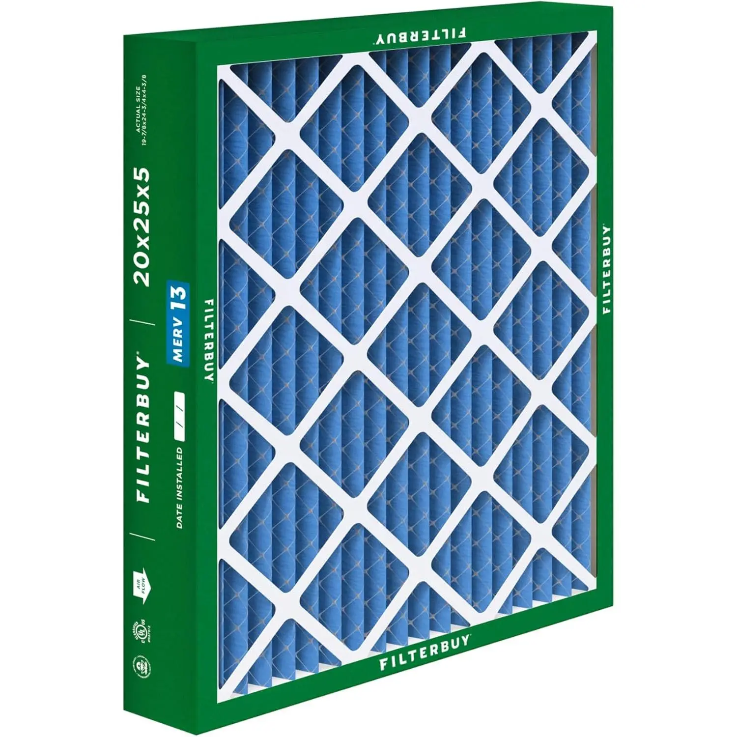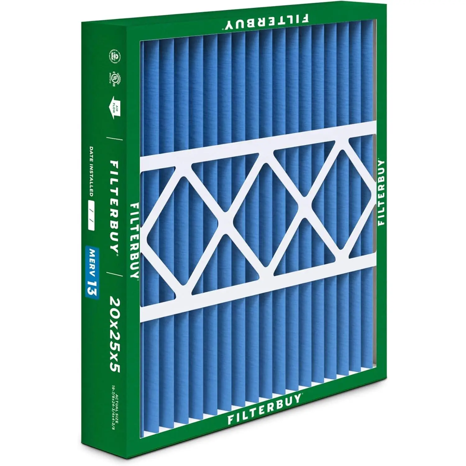 The Filterbuy replacement whole house air filter 20x25x5 (actual size: 19.88" x 24.75" x 4.38") ensures that your furnace, air conditioner, heat pump, or HVAC system is circulating the cleanest air possible to help preserve your budget and healthy lifestyle. MERV 13 synthetic media (comparable with Healthy Living Ultimate Allergen Defense MPR 1500 - 1900 & FPR 10) is recommended if you have a respiratory illness (such as asthma) due to its capability to trap 98% of airborne particles, protecting your home or business from bacteria, smoke, smog, debris, lint, pollen, mold, dander, and other forms of dust without impacting air flow. High quality construction features an electrostatically charged design with 12 pleats per foot that captures more harmful particles and prolongs the products lifespan by three times that of fiberglass models (replace every 90 days for best results). Plus, our industrial grade beverage board frames are paired with dual wire backings that significantly outperform traditional cardboard compositions by improving structural integrity with their ability to endure temperatures up to 200 degrees Fahrenheit and withstand exposure to moisture. Installation is also made simple with the addition of easy-to-understand arrows that help identify the direction of air flow and subsequently the way the filter needs to be placed. To top it off, all our components are 100% manufactured within the United States and designed with recyclable materials, providing an eco-friendly alternative to enhancing your air quality.