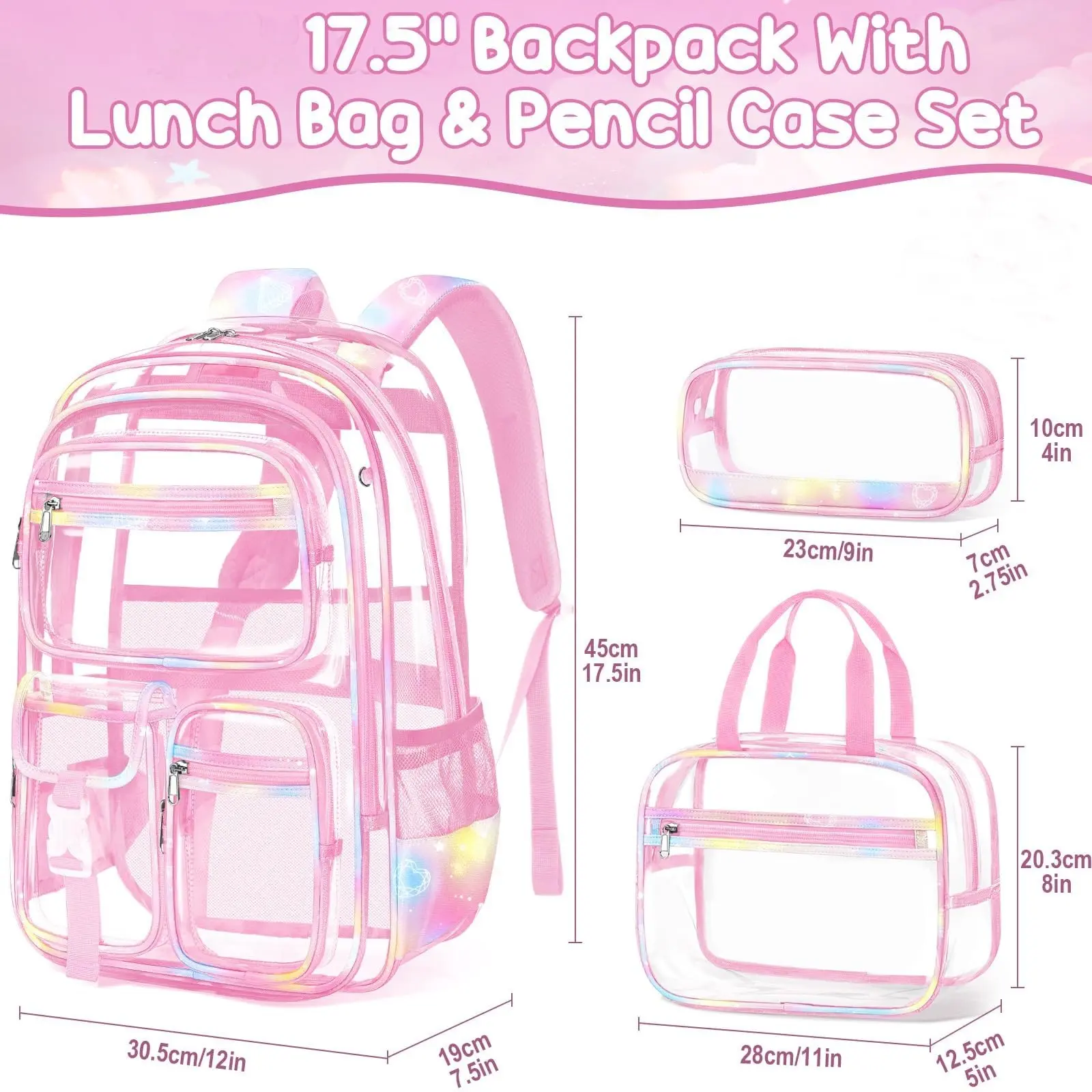 Fimibuke 17.5'' Clear backpack with lunch box & pencil case is a great choice , which not only provides plenty of space to pack everything we need in the school, but also can help pass through security checks quickly and keep essentials in clear view.