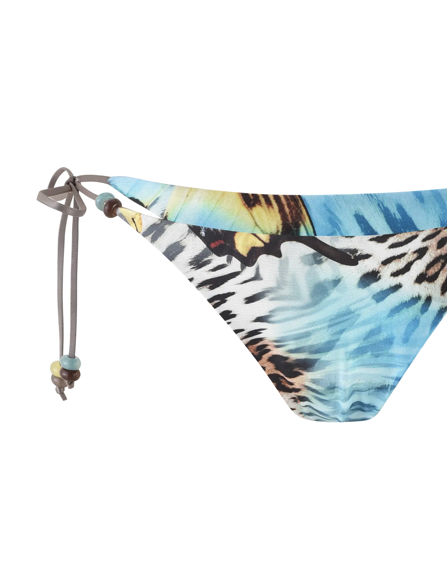 Our favorite Finlea bikini bottom in new blue butterfly and animal print Cheeky bikini cut style Elastane bikini brief True ties at sides in contrast brown Featuring beaded details on straps