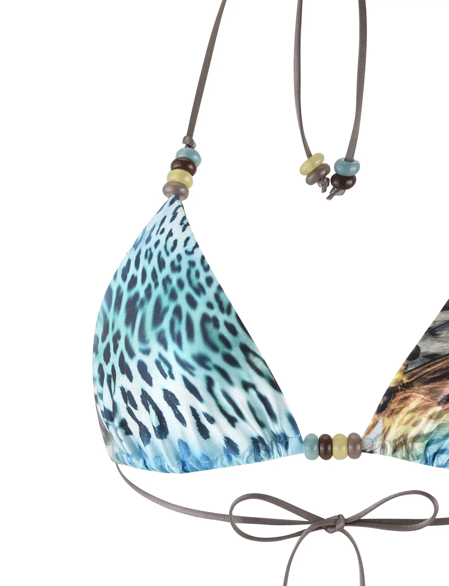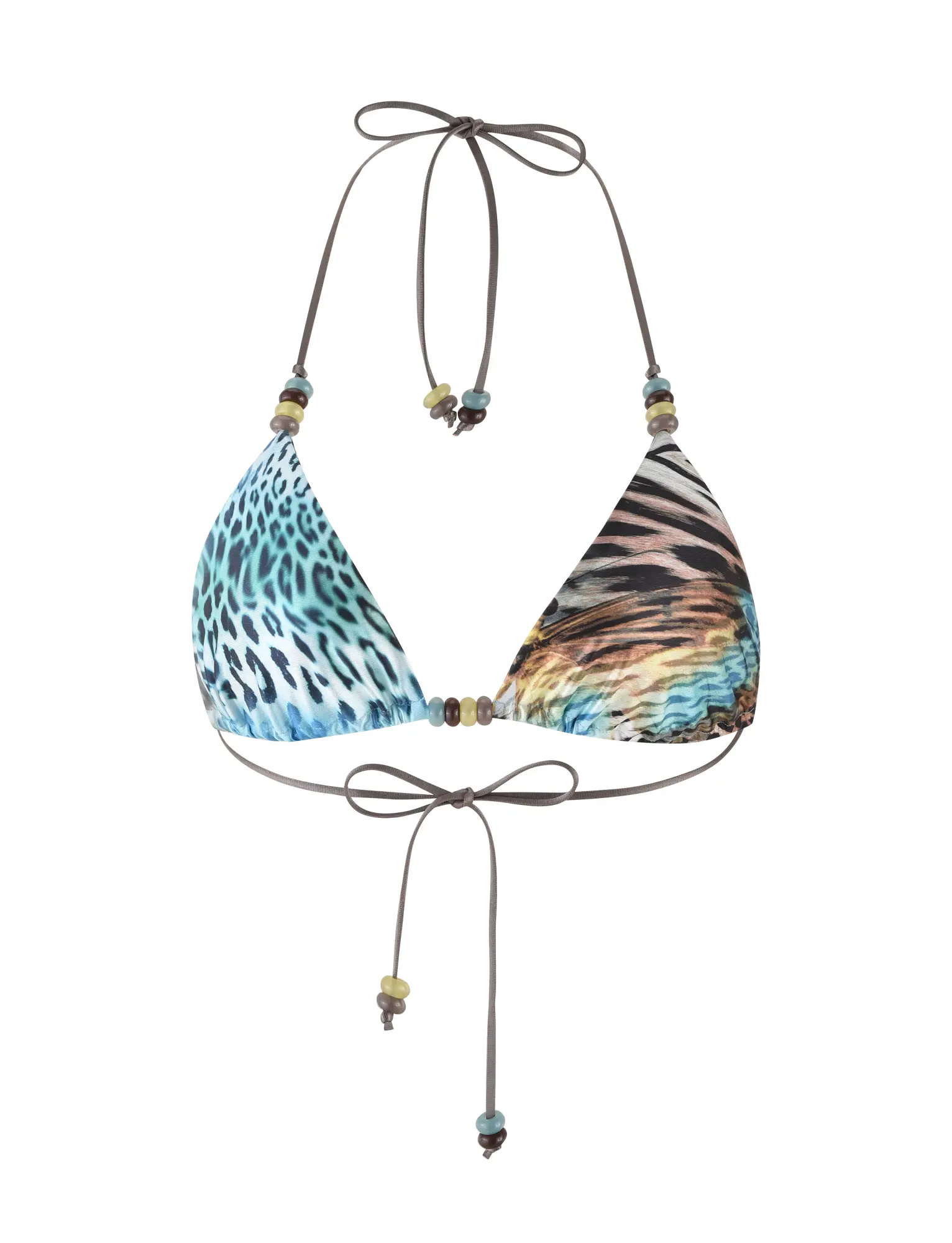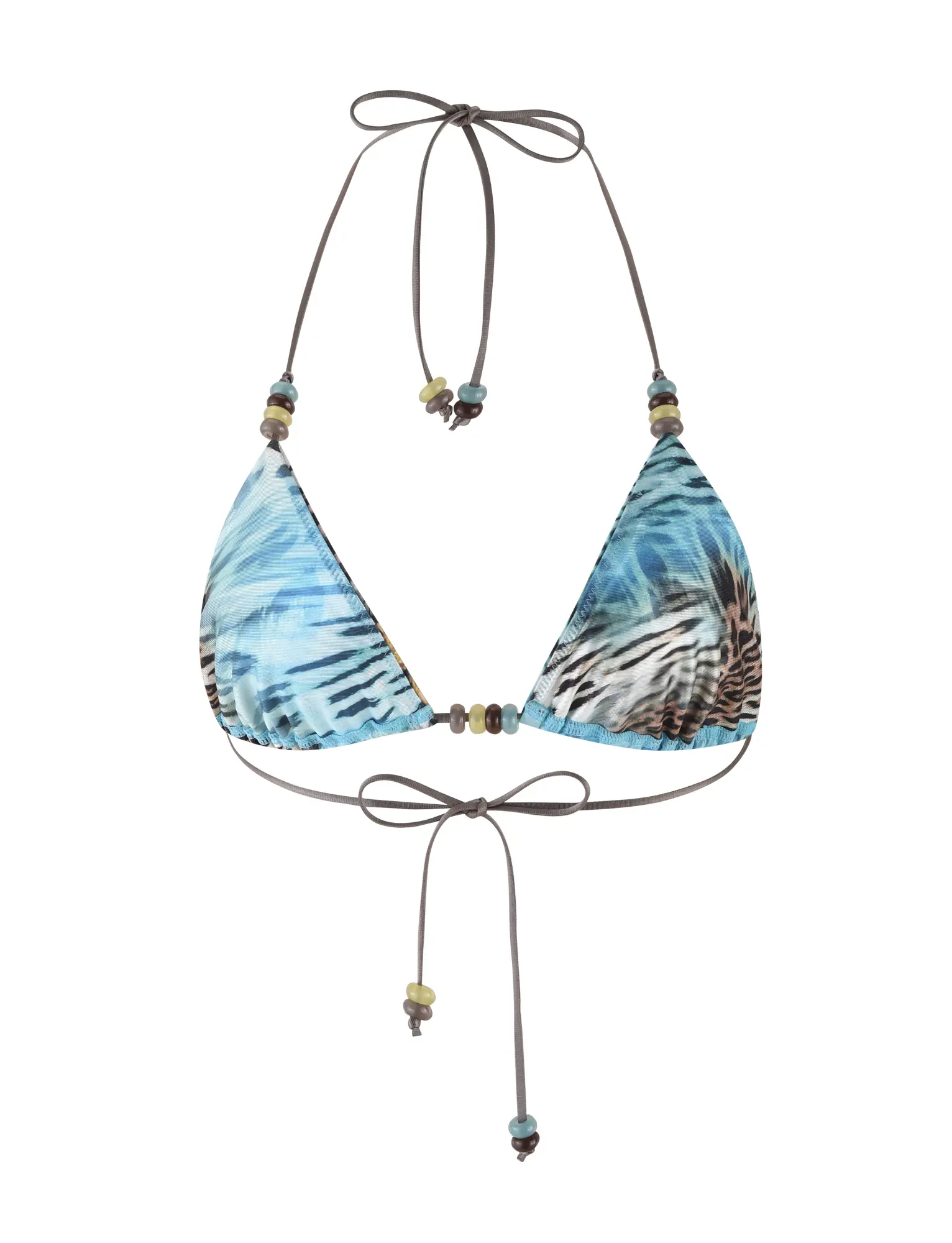 Best-selling Finlea Bikini Top in a new blue butterfly and animal print Fixed triangle bikini top with adjustable halter neck tie Adjustable style with true-tie neck and back bust ties in contrast brown Featuring beaded details on straps Fully Lined - This fabric is not sheer