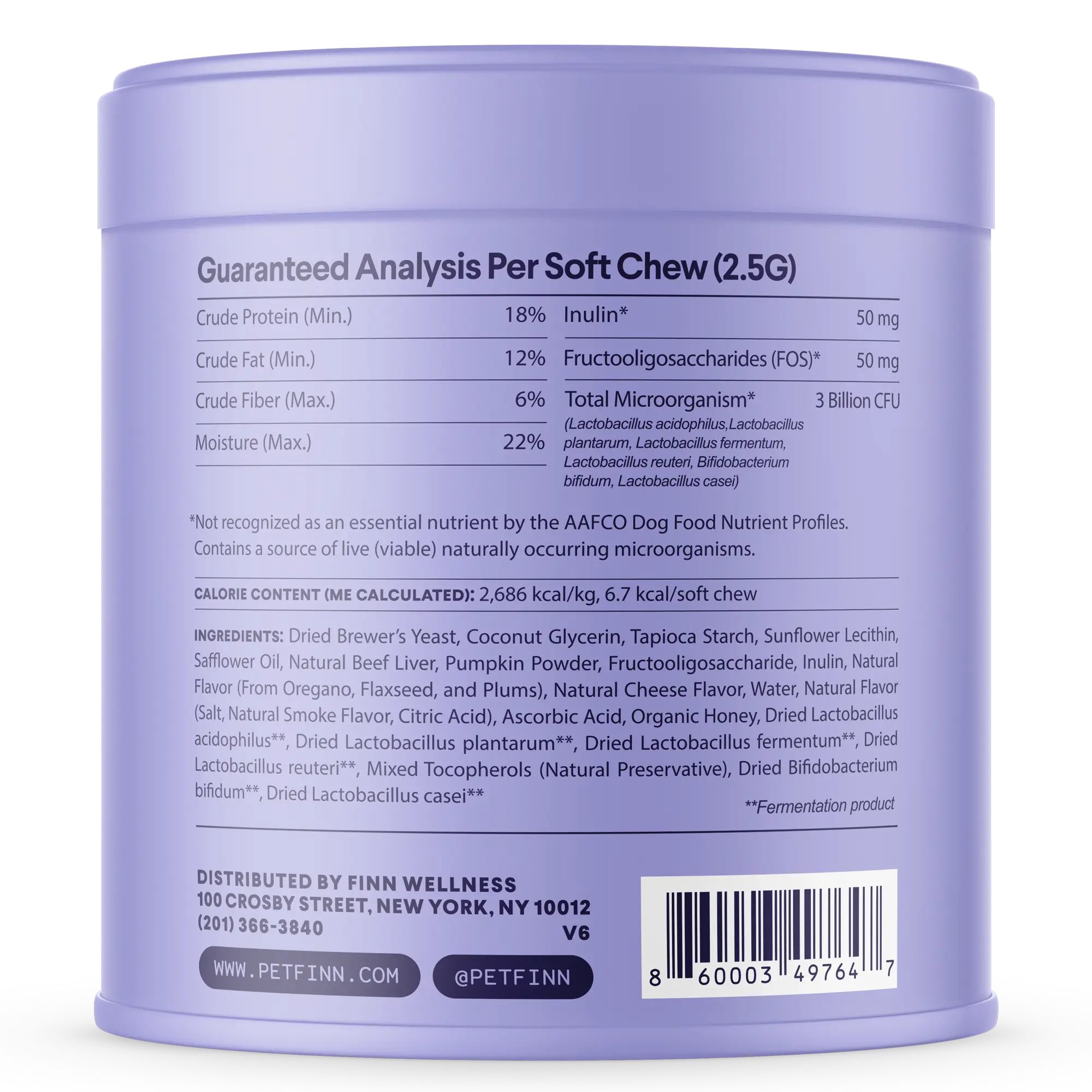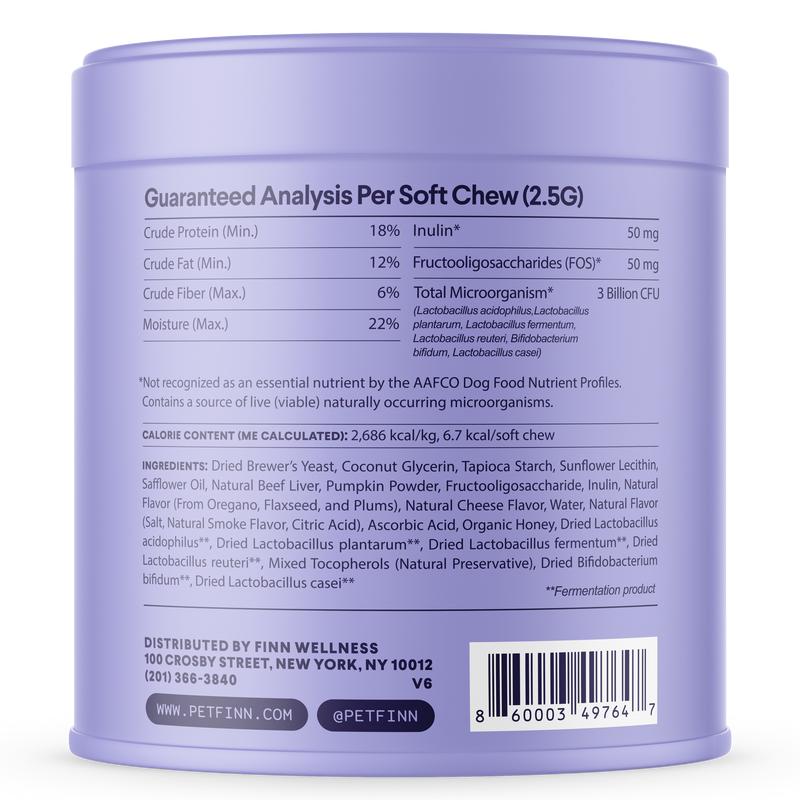• 3 billion CFU per chew with 6 probiotic strains, pumpkin, FOS, and inulin.• Improves gut health and digestion.• Ideal for dogs with sensitive stomachs.• Total Fat: 0g — 0%.• Cholesterol: 12mg — 3%.• Calories: 10 kcal.• Pumpkin Powder: 75mg.• Inulin & FOS: 100mg.• 6-Strain Probiotic Blend: 3 Billion CFU.
