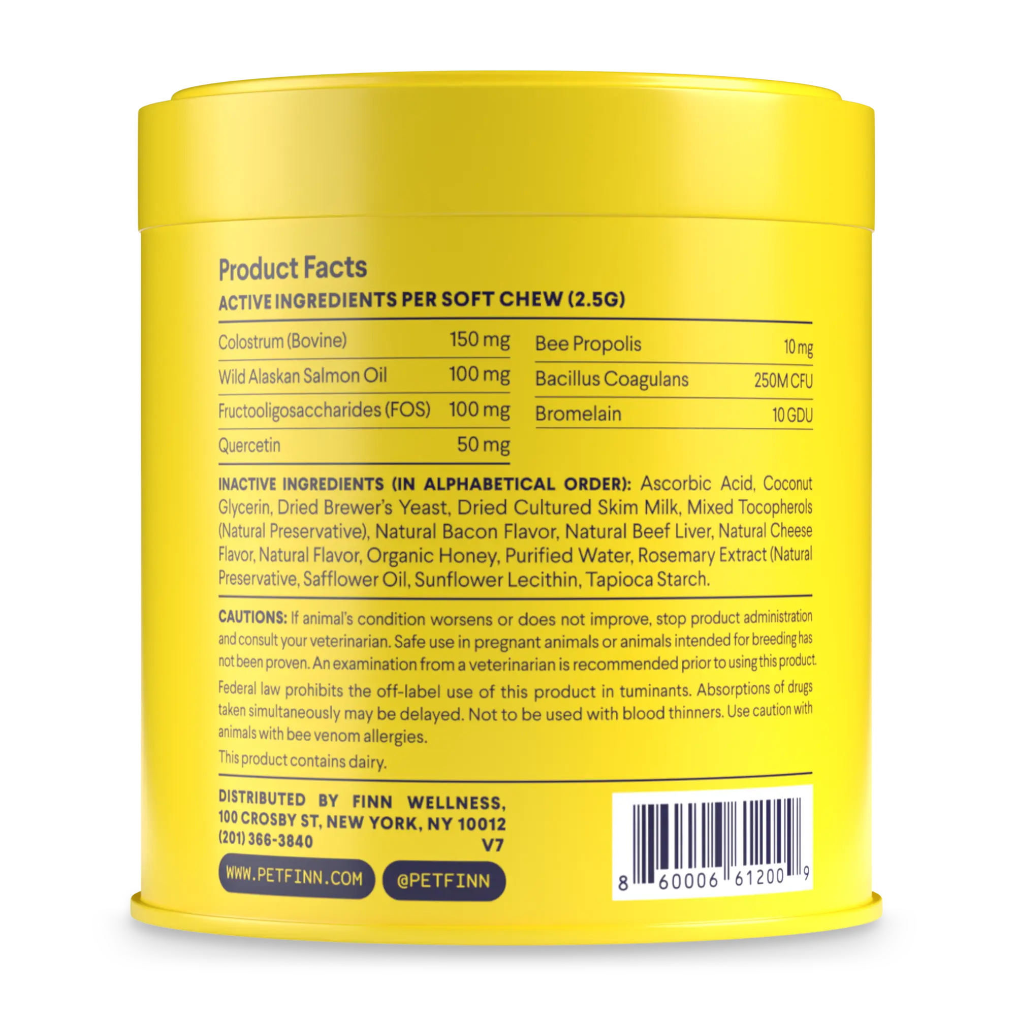 • Colostrum, bee propolis, wild Alaskan salmon oil, probiotics, quercetin, and bromelain.• Reduces itchy skin & allergies.• Boosts immunity from the inside out.• Total Fat: 0g — 0%.• Cholesterol: 12mg — 3%.• Calories: 11 kcal.• Bee Propolis: 80mg.• Colostrum: 50mg.• Wild Alaskan Salmon Oil: 100mg.• Quercetin: 25mg.• Bromelain: 10mg.• Probiotic Blend: 200M CFU.