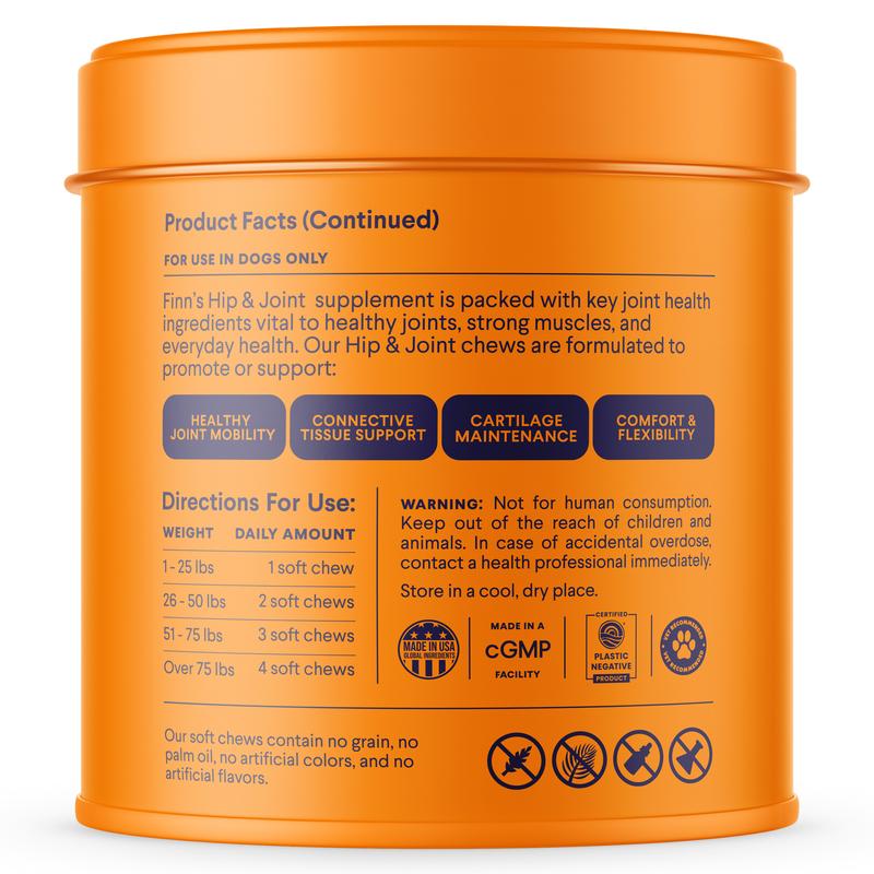 Finn Hip & Joint Supplement is designed to support your dog’s joint health, ensuring they stay active and comfortable for longer. Each soft chew contains a potent blend of Glucosamine, Chondroitin, MSM, and natural anti-inflammatories to promote healthy joints, reduce pain, and enhance mobility.