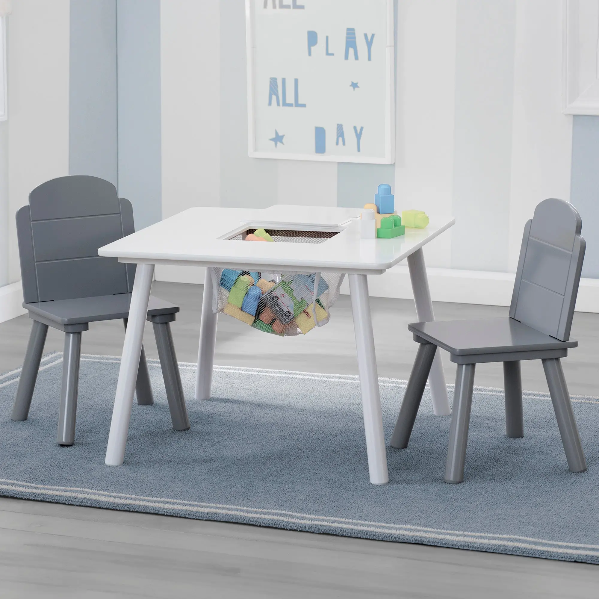 This is perfect! We put their magnetic blocks in the net. All you need is a screwdriver to attach the seat and back of the chairs and the legs just twist on!