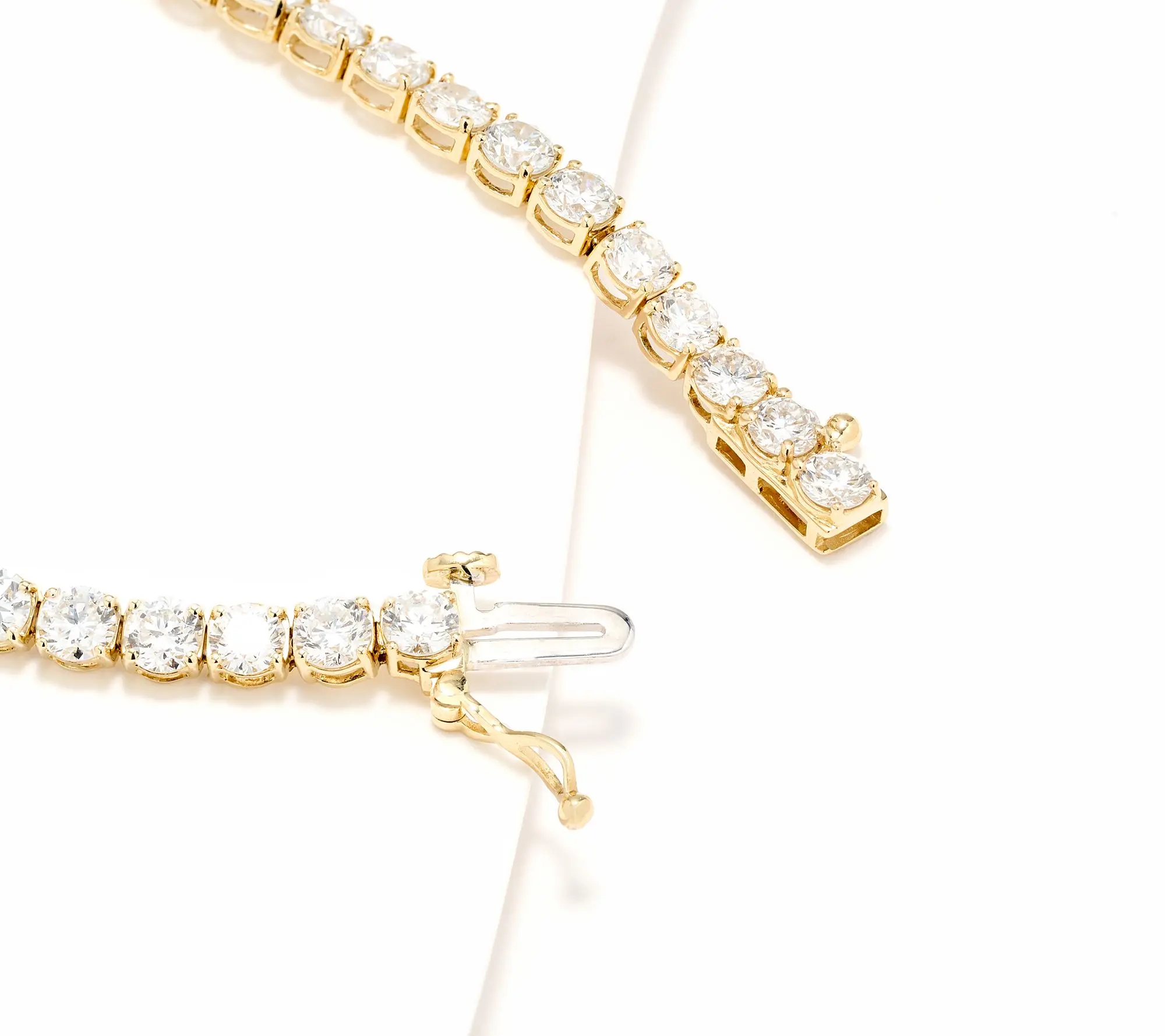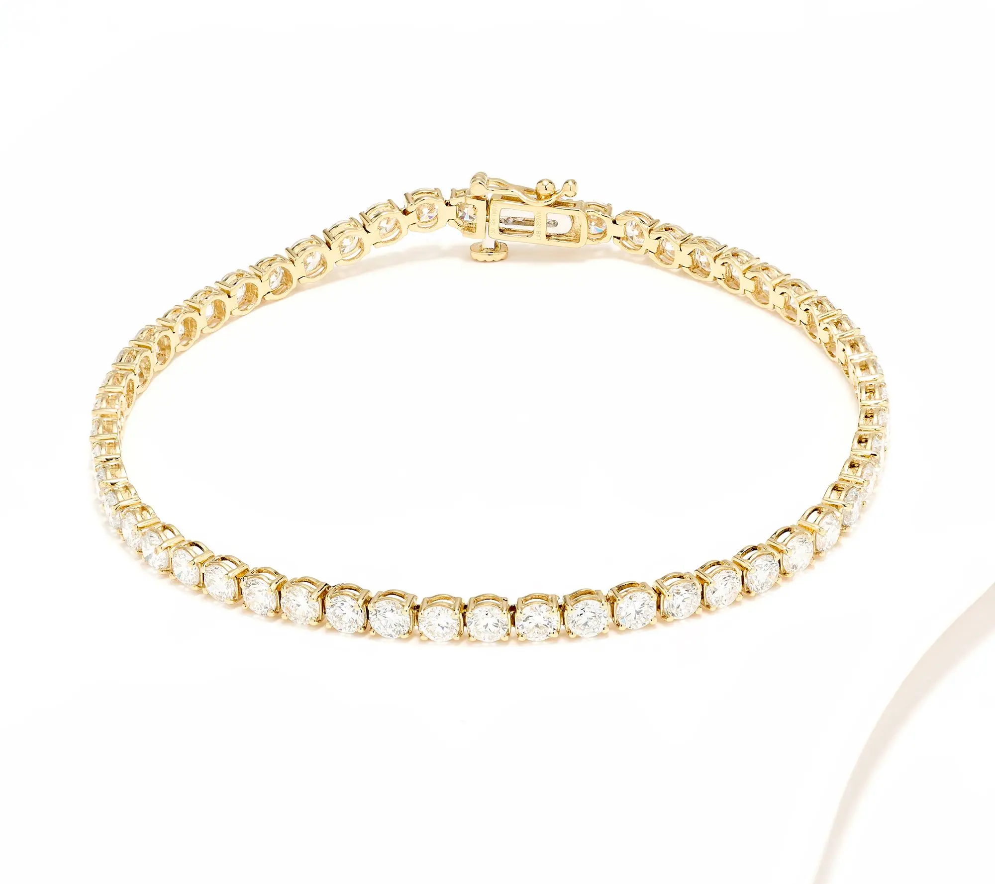·White, round, prong-set lab-grown diamonds in tennis-style bracelet design; polished finish
