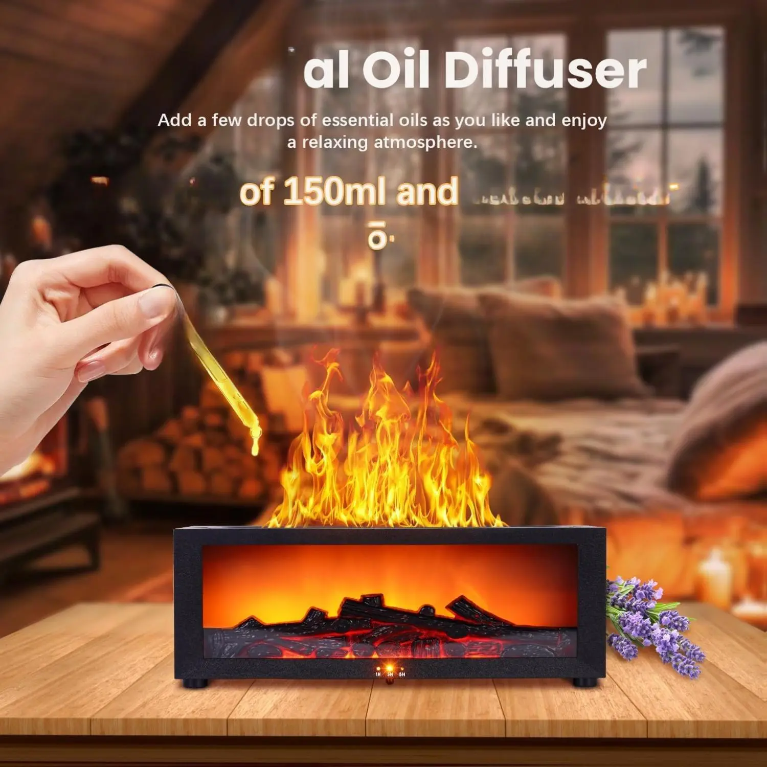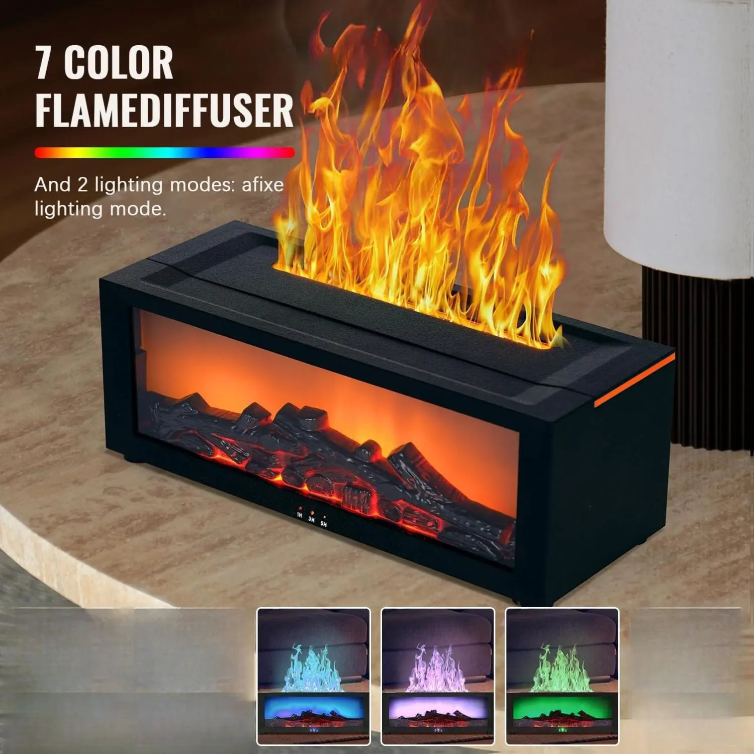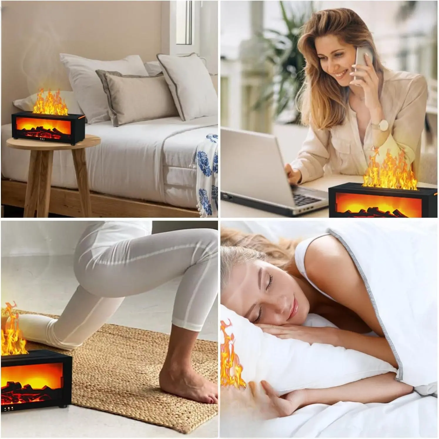4-in-1 Ultrasonic humidifier & Aromatherapy Oil diffuser with realistic flame effect and 7-color night light, creates a realistic flame effect, as if a warm flame is burning right in nt. Add 3-5 drops of your favorite essential oil to relieve fatigue and moisturize the skin.