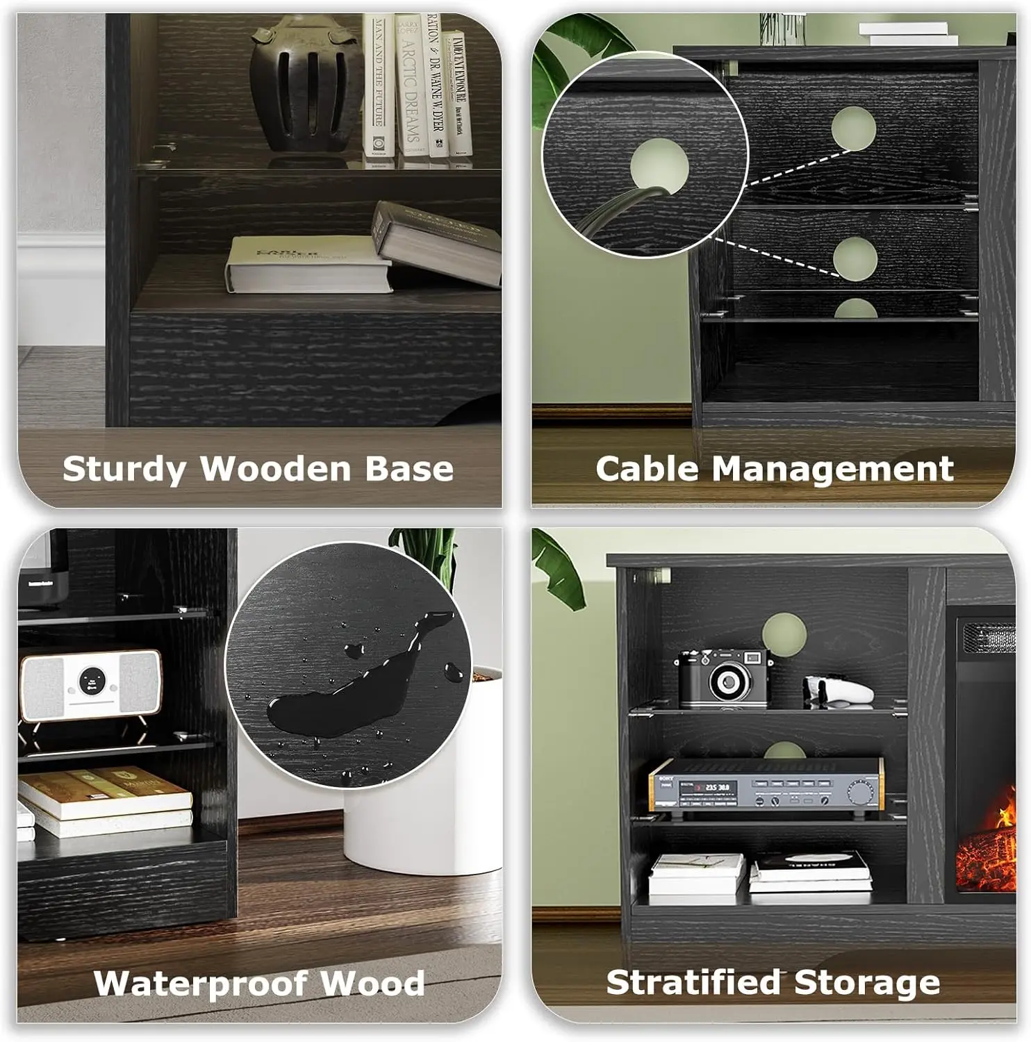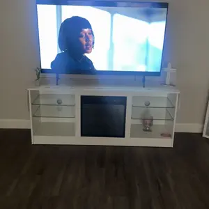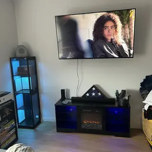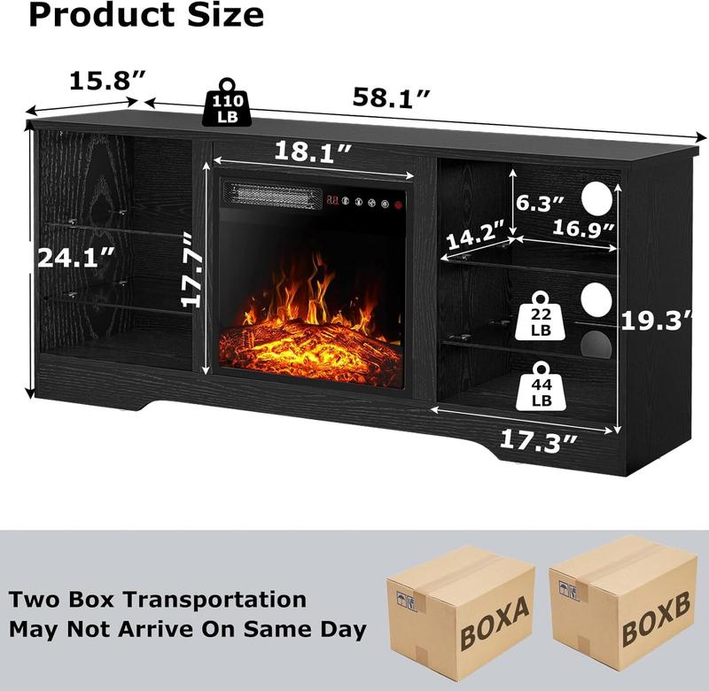 ·Perfect Size for Your Room:This fireplace TV stand measures 58" L x 15.75" W x 24" H and is perfect for TVs up to 65 inches. Made from MDF, it has a sturdy construction and can hold up to 110lbs on the top, 22lbs on the glass shelves and 44lbs on the bottom shelf, which ensures that your TV and decorative items can be safely and stylishly placed, creating a stylish and tidy atmosphere for relaxing and entertaining.