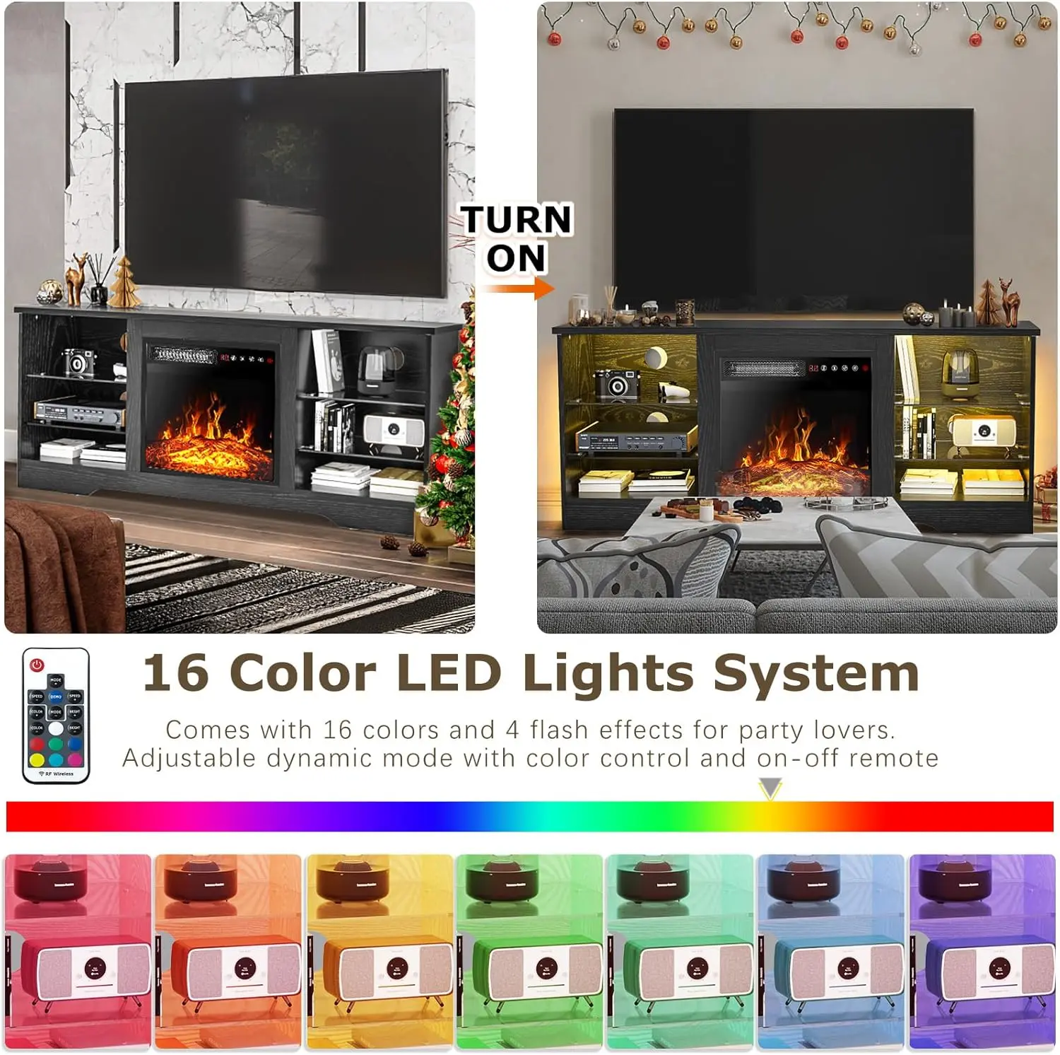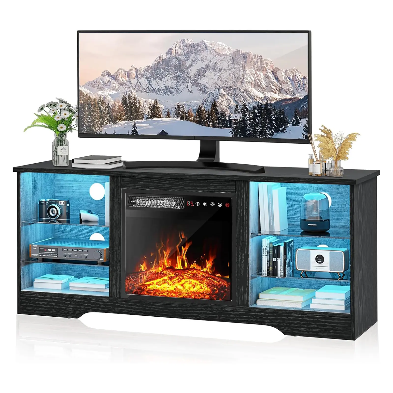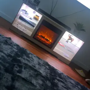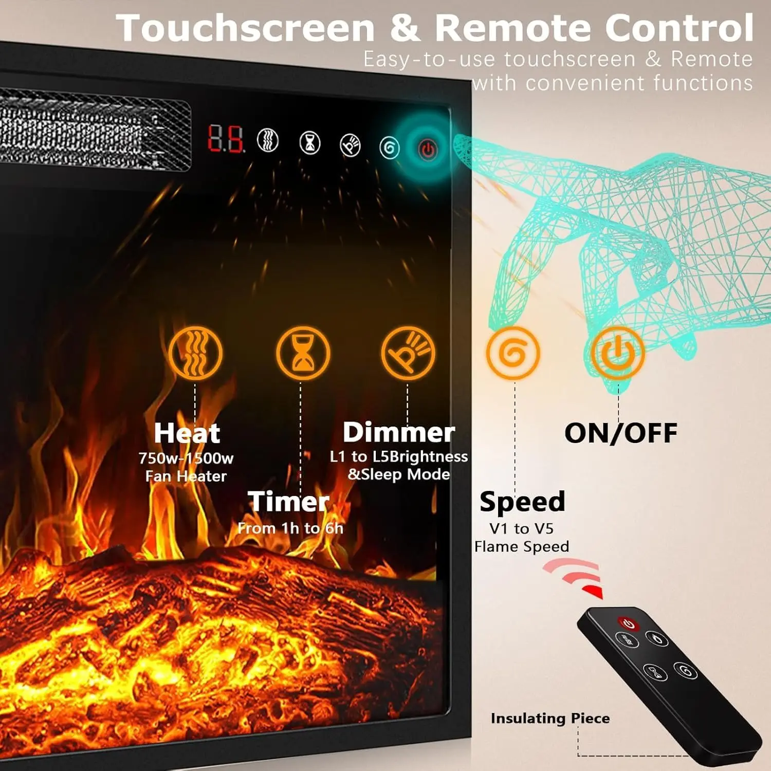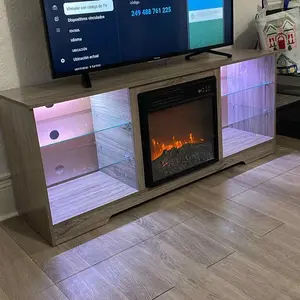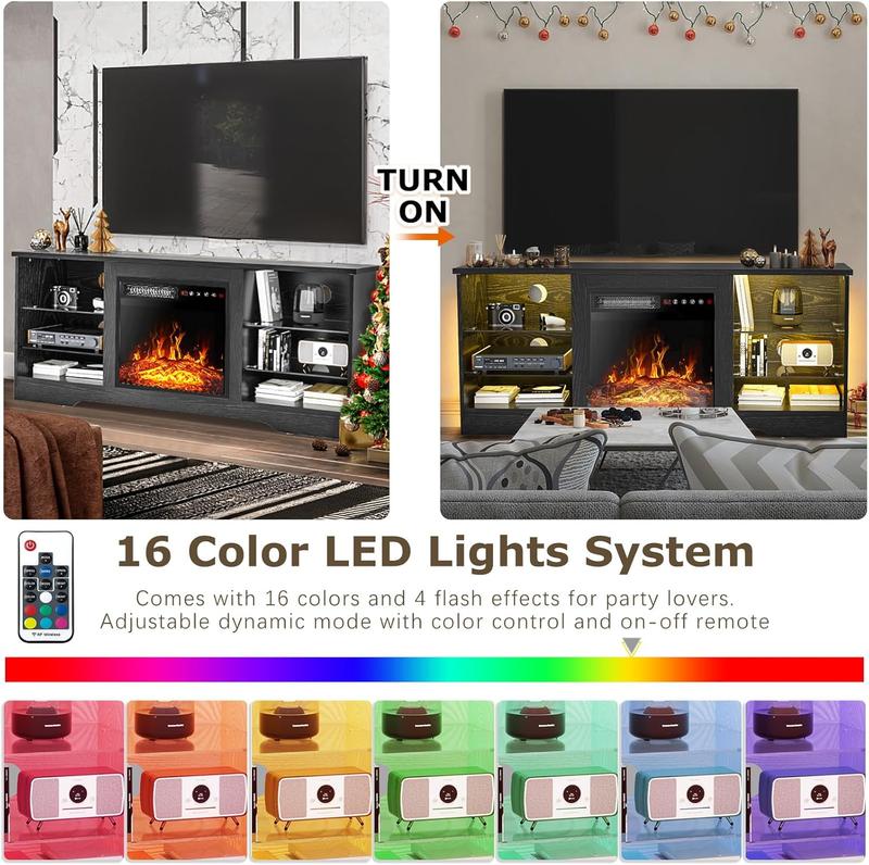 ·3D Flame 18inch Fireplace:The TV cabinet can accommodate an 18 inch electric fireplace.Two heating settings 750W-1500W, you can set the temperature you want, and its powerful heating element will bring your 350 square feet room to the perfect temperature.The remote control and touch screen make it easier to control every function of the electric fireplace, power switch, 1 to 6 hours timer control, independent switch for heat and flame,5 adjustable flame brightness and speed, sleep mode function.