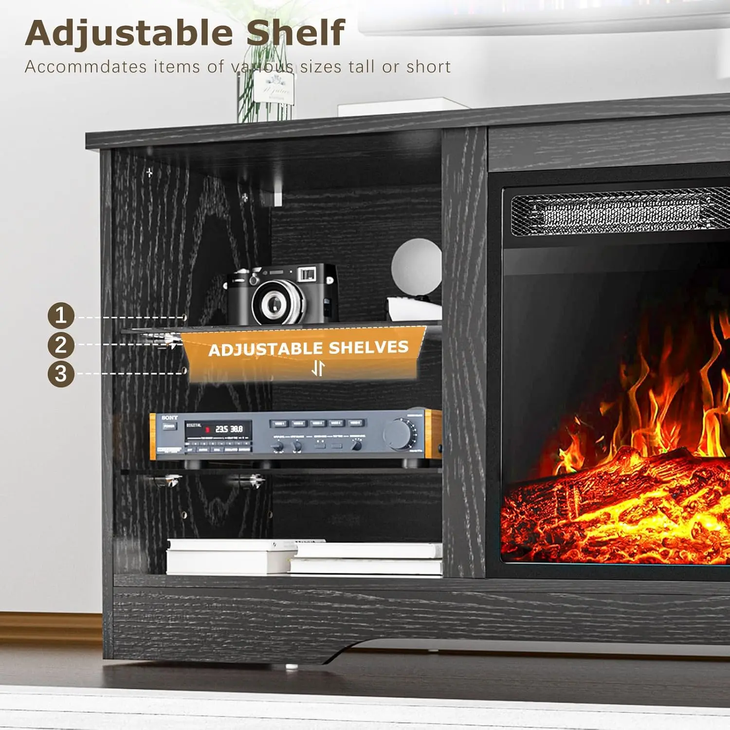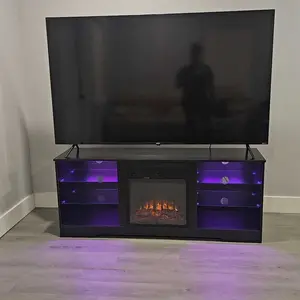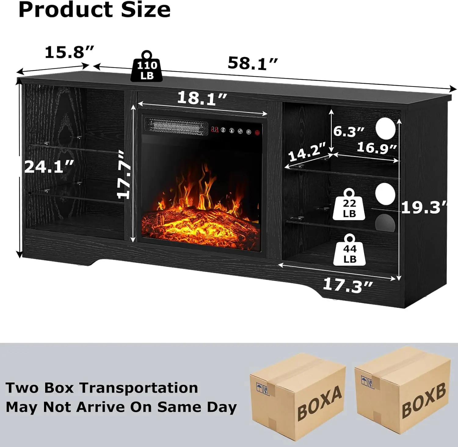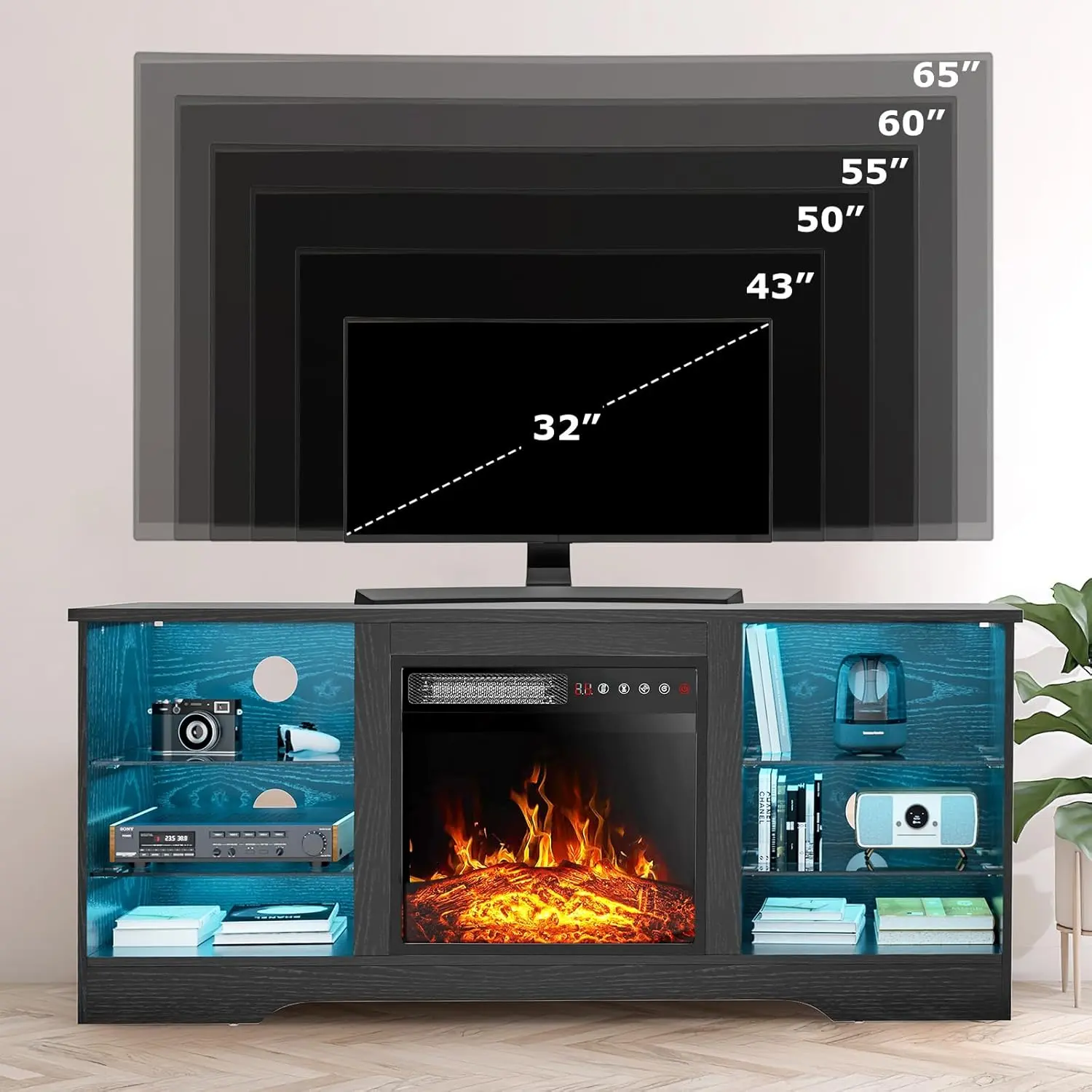 ·3D Flame 18inch Fireplace:The TV cabinet can accommodate an 18 inch electric fireplace.Two heating settings 750W-1500W, you can set the temperature you want, and its powerful heating element will bring your 350 square feet room to the perfect temperature.The remote control and touch screen make it easier to control every function of the electric fireplace, power switch, 1 to 6 hours timer control, independent switch for heat and flame,5 adjustable flame brightness and speed, sleep mode function.