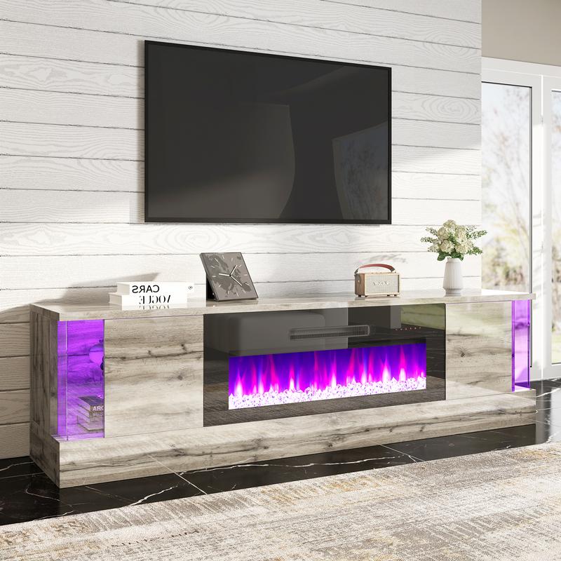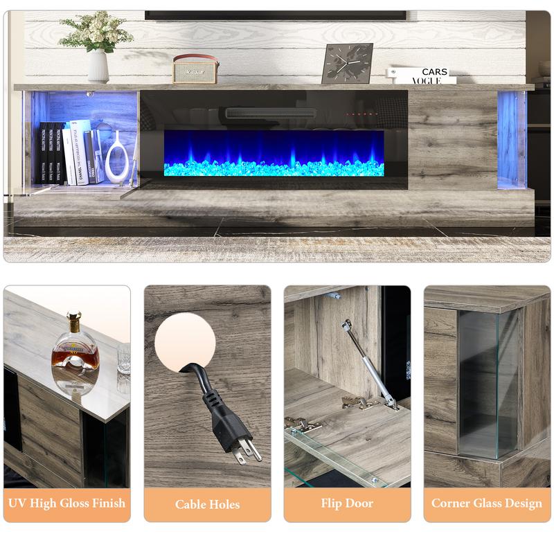 Β·[LED Lights TV Console] Includes a 7-color LED kit, which synchronizes with the fireplace crystal color and offers a total of 64 color combinations, transparent corner glass decor on both sides provides a home theater-like visual experience