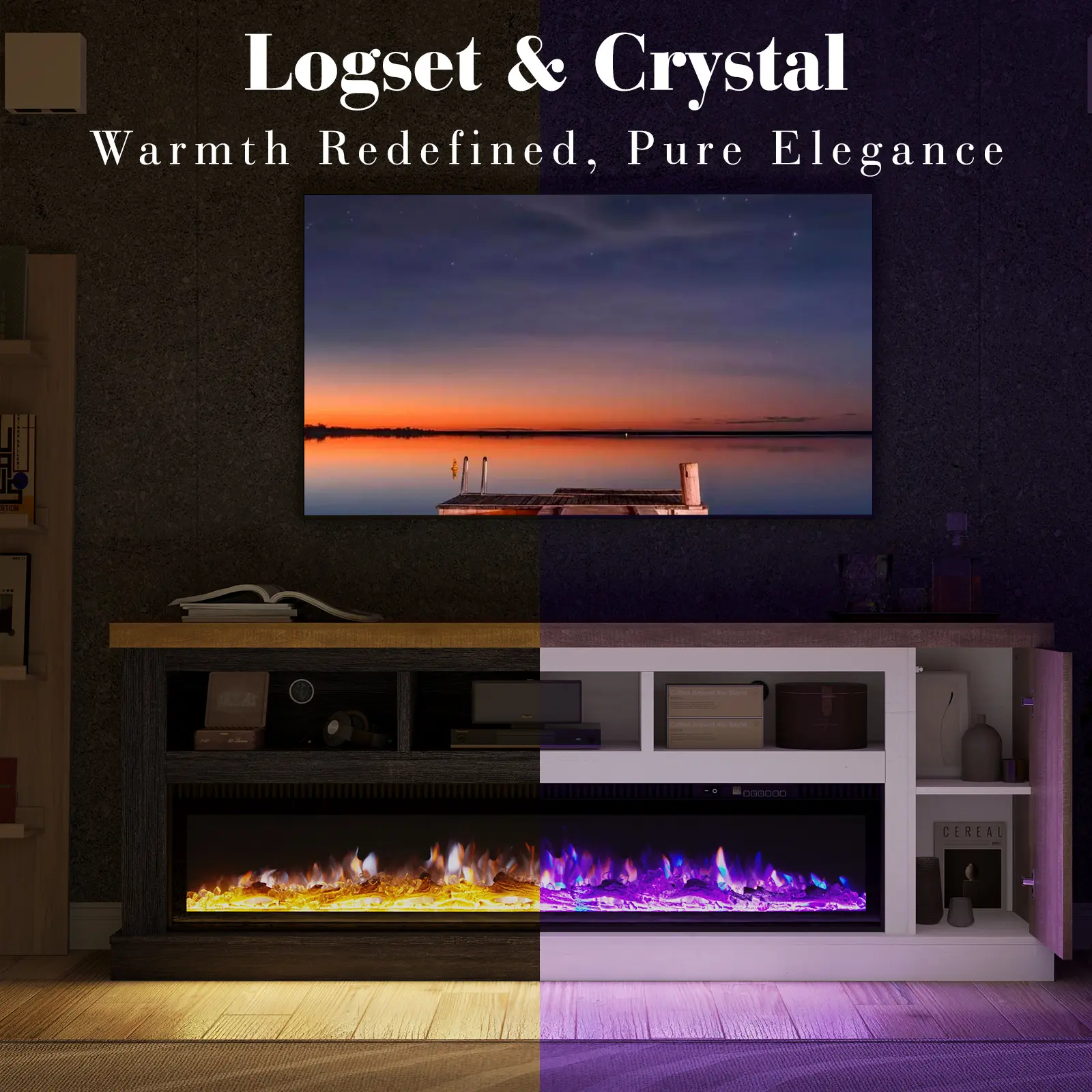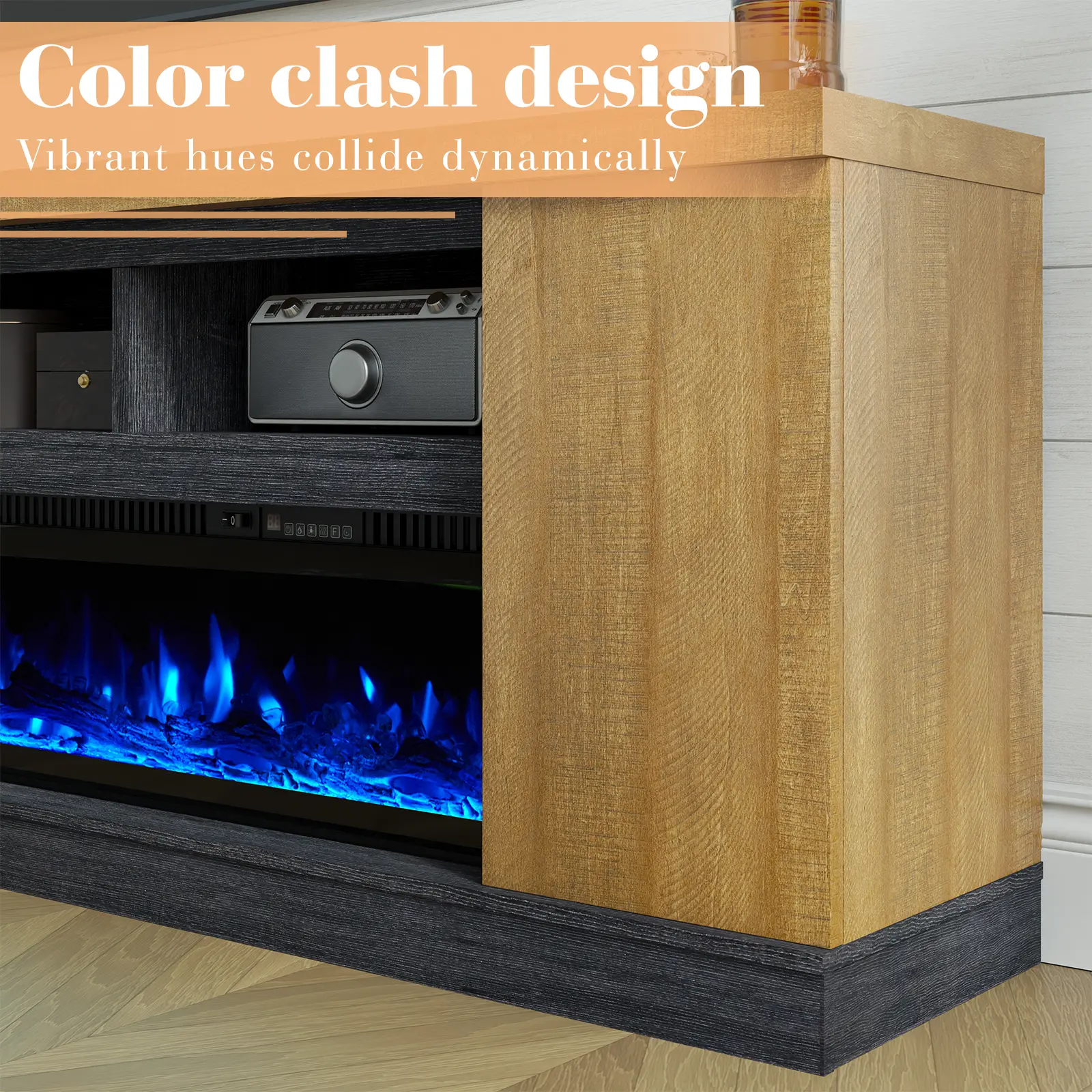 Contrasting Colors: Unique blend of rich colors and intricate wood grain enhances visual appeal. This tv console with fireplace creating a distinctive atmosphere that captivates with richness.