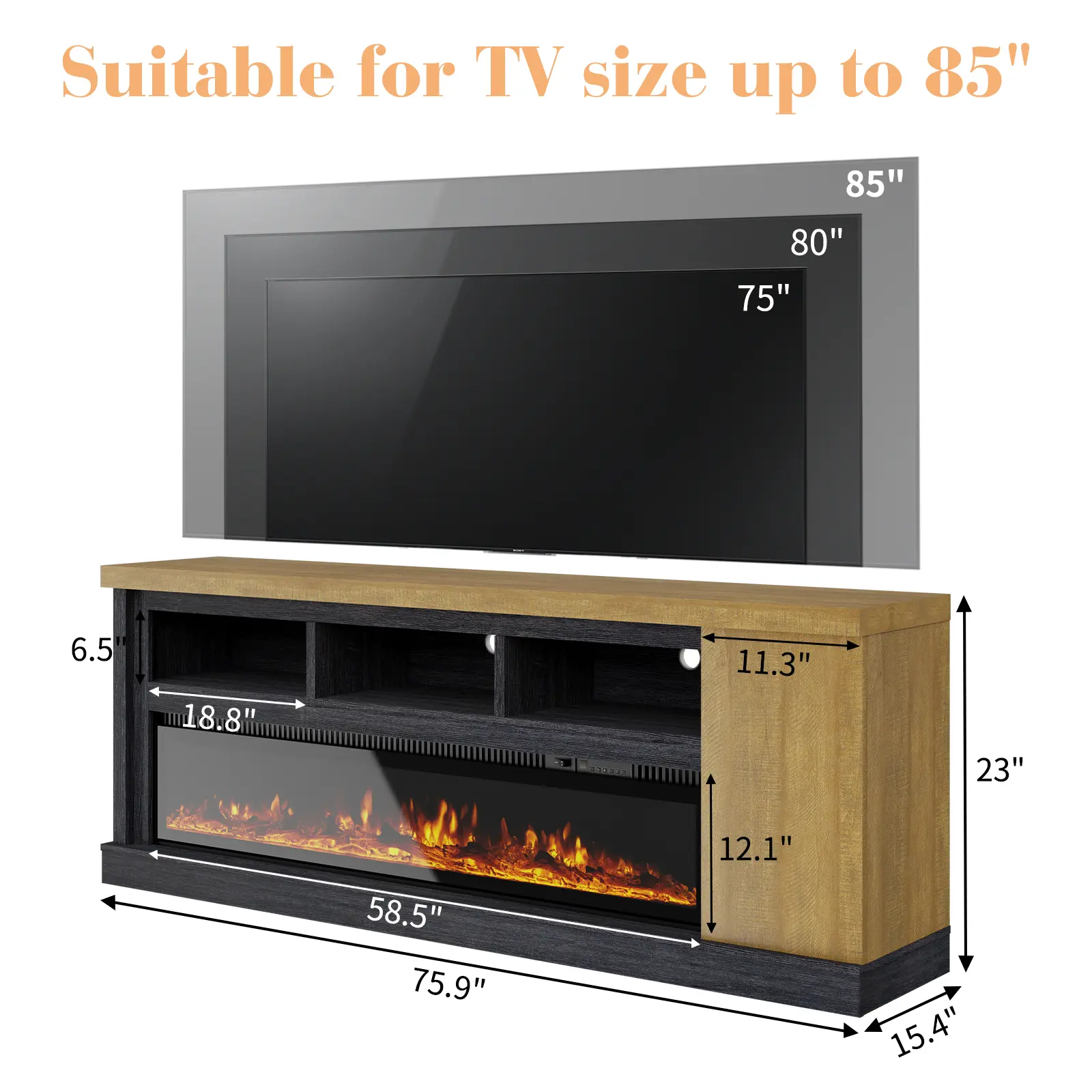 VanAcc 75” Fireplace TV stand w 60” Electric Fireplace,Chunky Entertainment Center with Wood Grain,Color Clash Entertainment Stand for TVs up to 85”