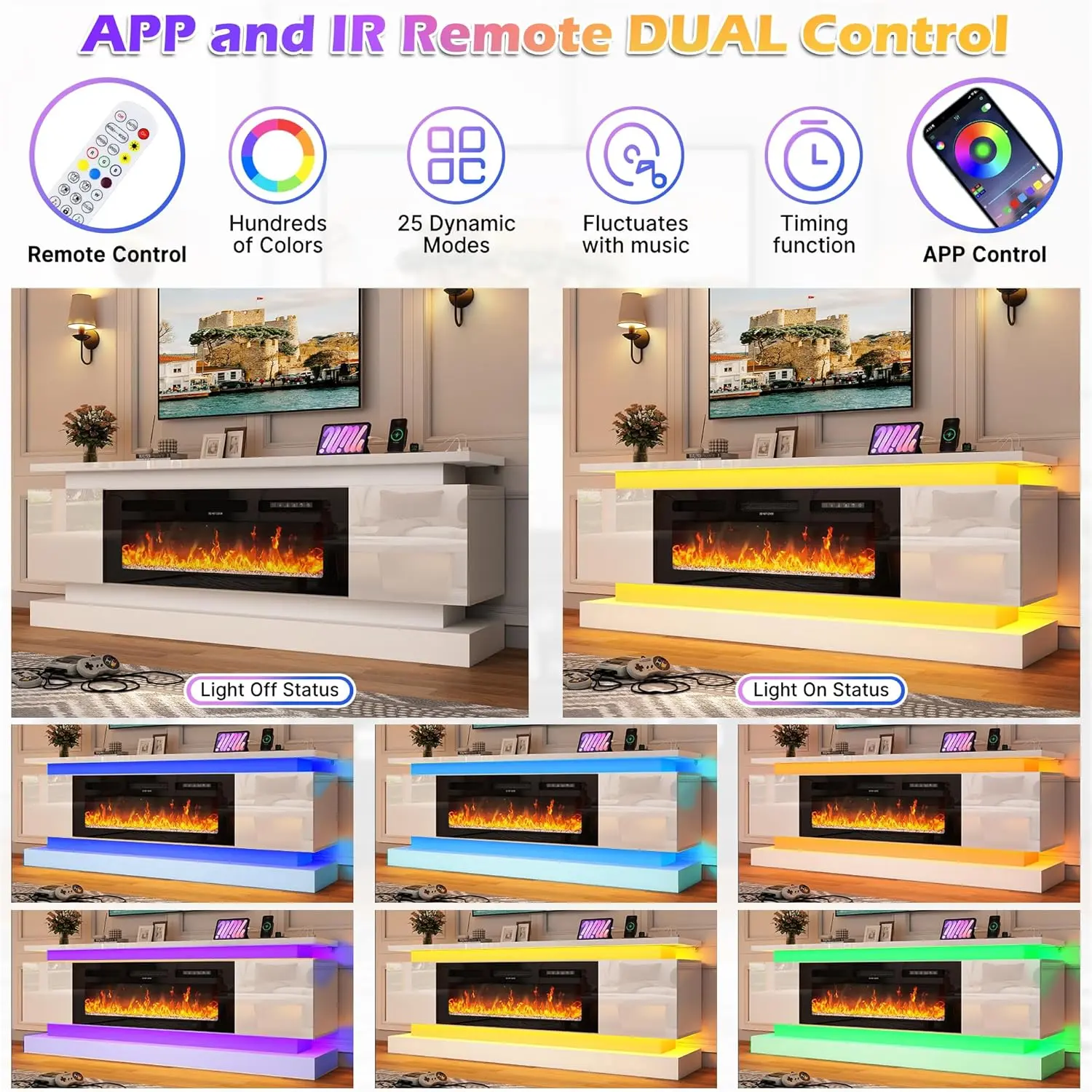 ·Cool and intelligent dual RGB lighting design: The LED TV cabinet is designed with LED light strips on the top and bottom. The top LED light strip provides upward lighting, which can reduce the contrast around the TV screen, reduce visual fatigue, and improve viewing comfort. The bottom LED light strip creates a floating effect, making the TV cabinet look more technological and futuristic. You can adjust the color, brightness, and different dynamic flashing modes of the lights through the remote control or APP to create a personalized viewing, gaming, or music environment. This entertainment center with LED lights makes watching videos and playing games a more immersive experience