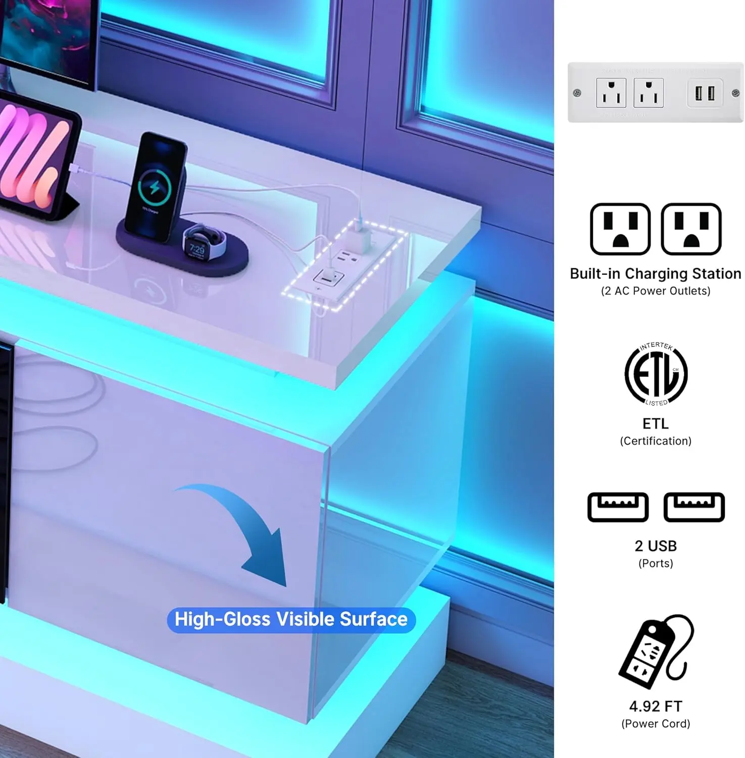 ·Built-in power outlets: The LED TV cabinet is equipped with 2 built-in USB ports and 2 standard outlets, which are convenient for powering electronic devices such as TVs, game consoles, stereos, routers, etc., reducing the clutter of extension cords and making your entertainment center more organized, saving outlet space. The 15.8-inch wide LED TV cabinet supports 40, 45, 50, 55, 60, 65, 70,75,80,85 inch TVs. It is suitable for all types of TVs, including wall-mounted and standing models
