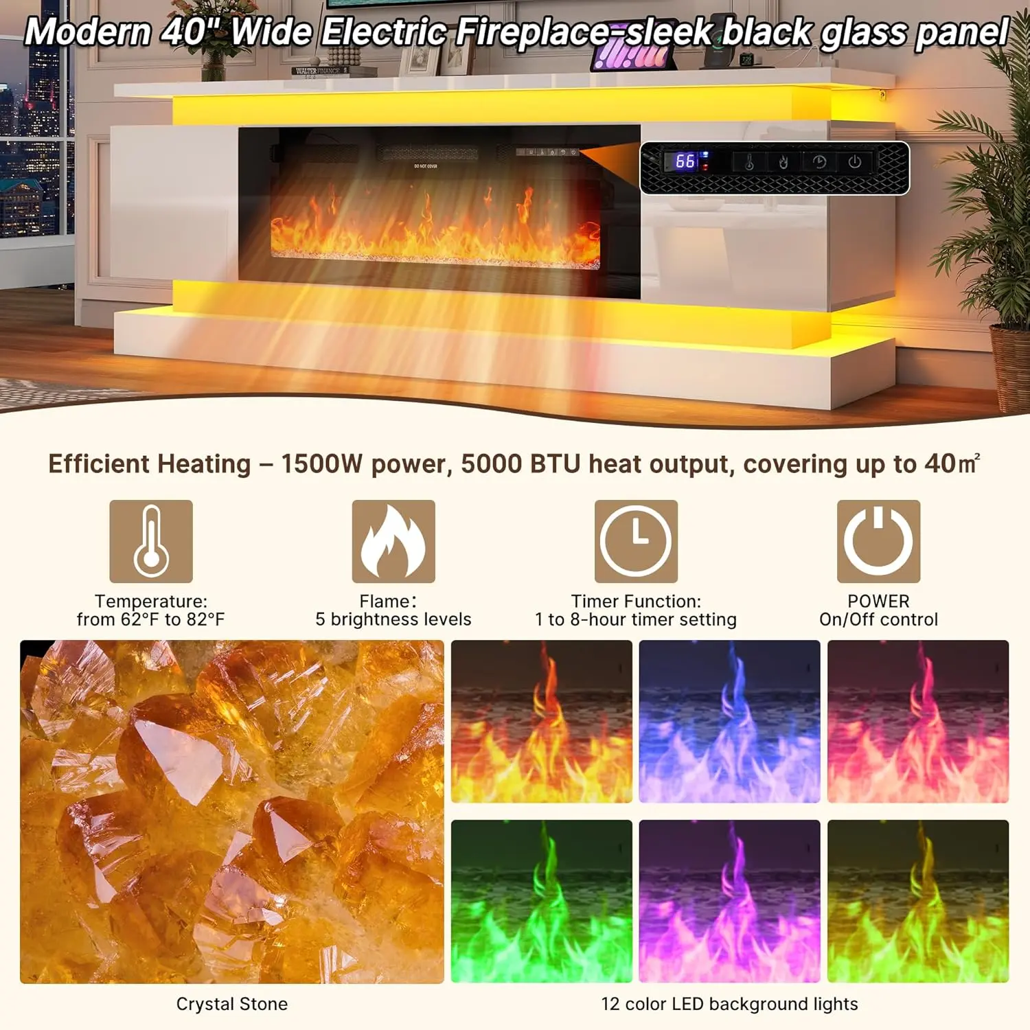 ·40“ wide crystal electric fireplace: The 40” fireplace is equipped with tempered glass, adjustable temperature (62°F-82°F), 1-8 hour timer, digital thermostat and 1500W heating power, covering an area of up to 40 square meters (5000 BTU heat output). The crystal stone bed enhances the atmosphere, while the remote control and overheat protection ensure convenience and reliability. It is a reliable choice for year-round comfort and modern home decor