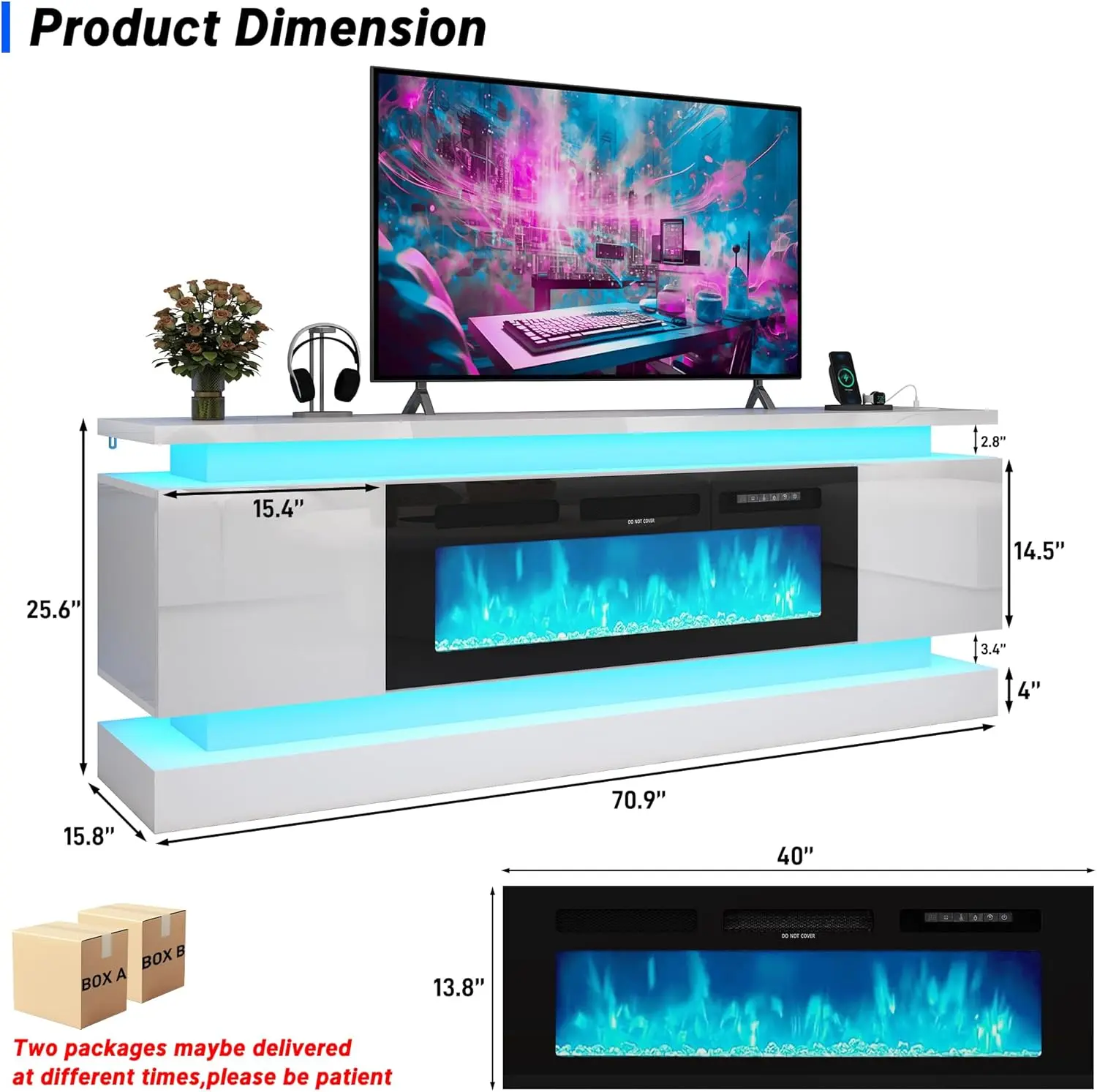 ·Convenient 2-box delivery: This entertainment center with fireplace is delivered in two separate packages, which may arrive at different times. The packages are padded with shock-absorbing foam and protective wooden boards to ensure delivery. Easy to assemble, so you can quickly and easily enjoy your fireplace TV stand. It is recommended that two people assemble together to speed up the assembly process