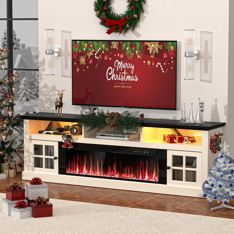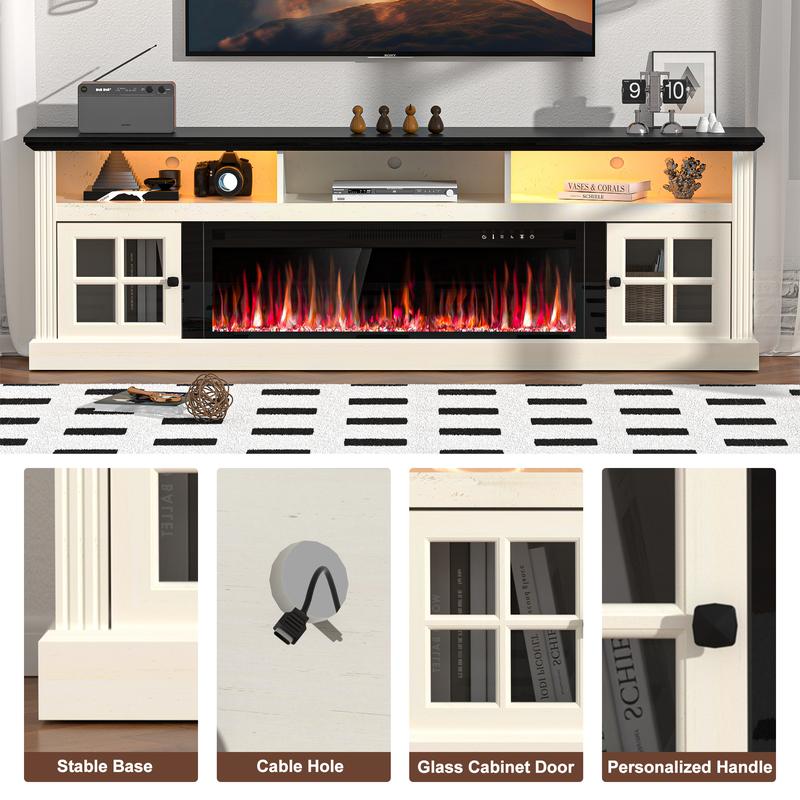 ·Farmhouse Style TV Stand: The wood grain vintage table top is made of high quality decorative laminate and is paired with white cabinets for a vintage and casual look. This 70 inch TV stand is paired with a 36 inch fireplace for both beauty and practicality, and fits seamlessly into various rooms like the living room, bedroom, or entertainment space